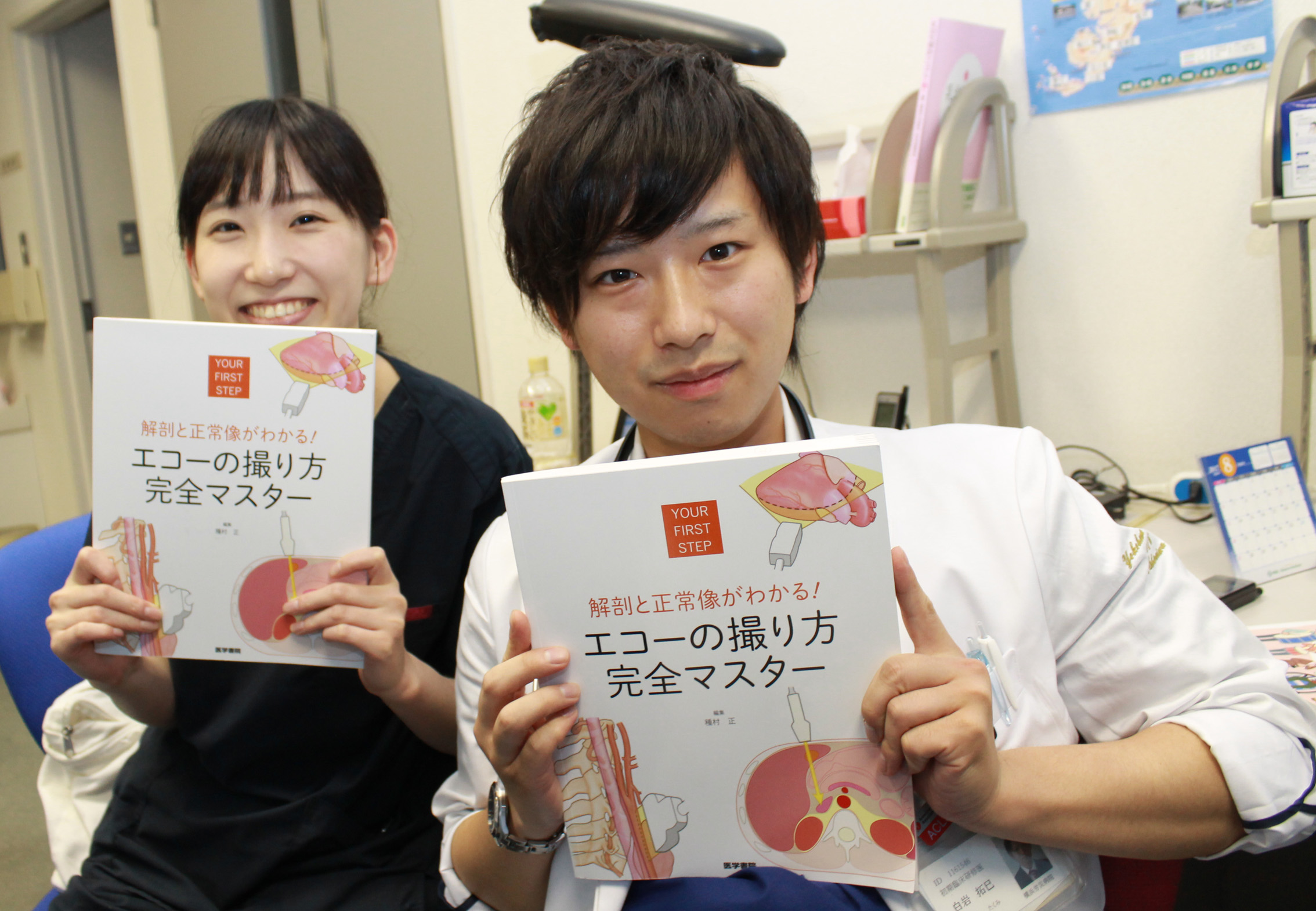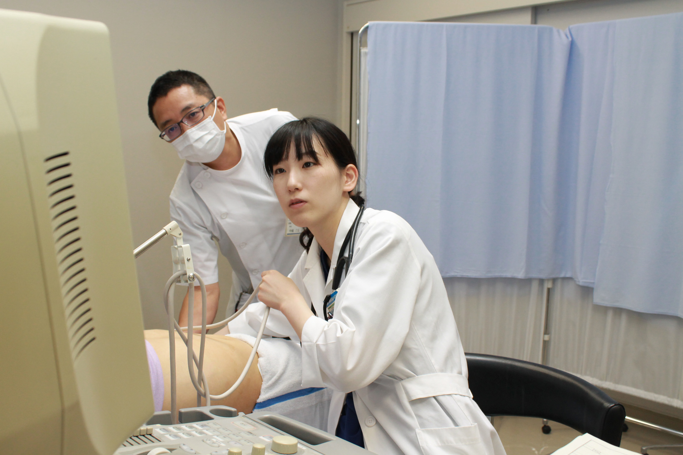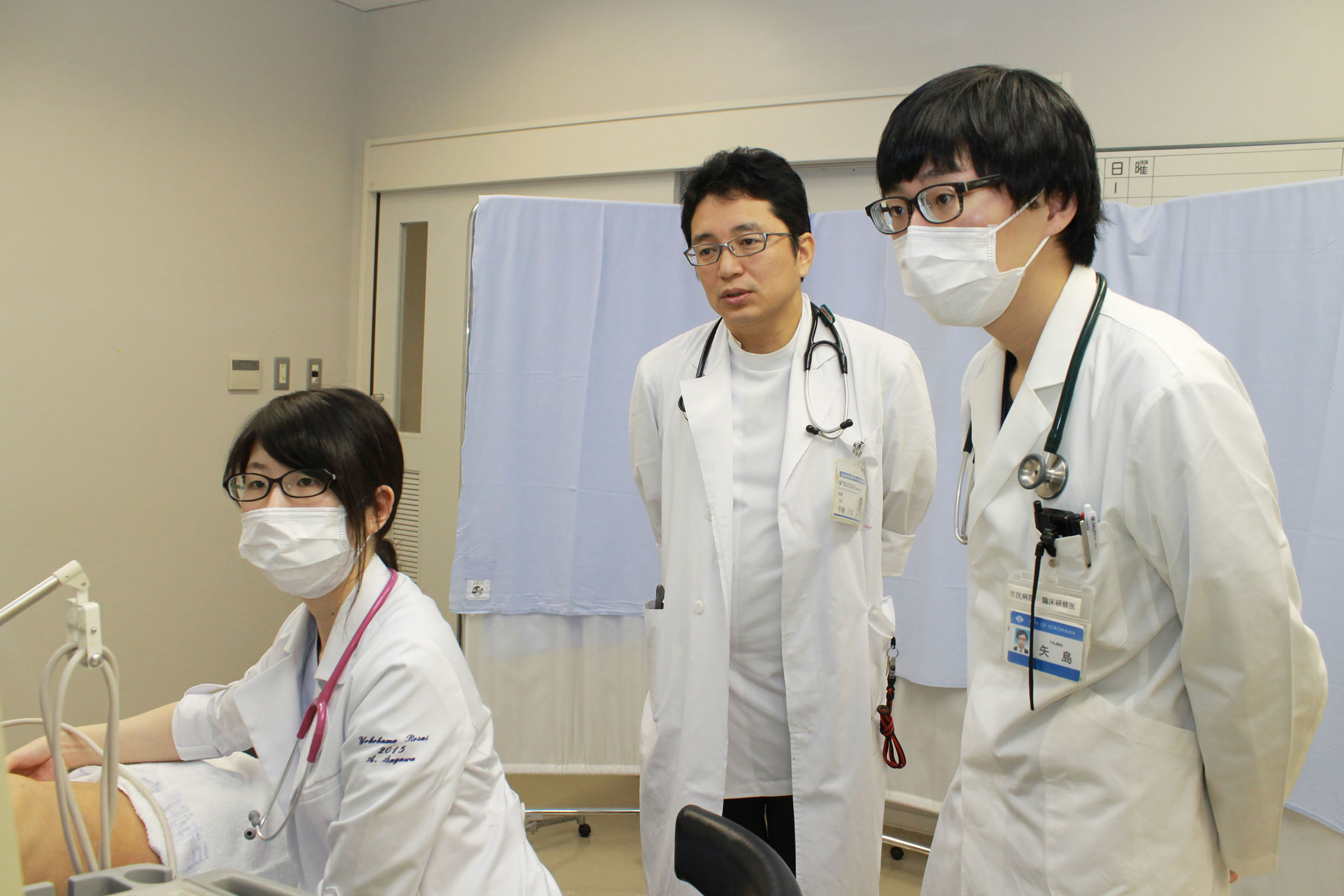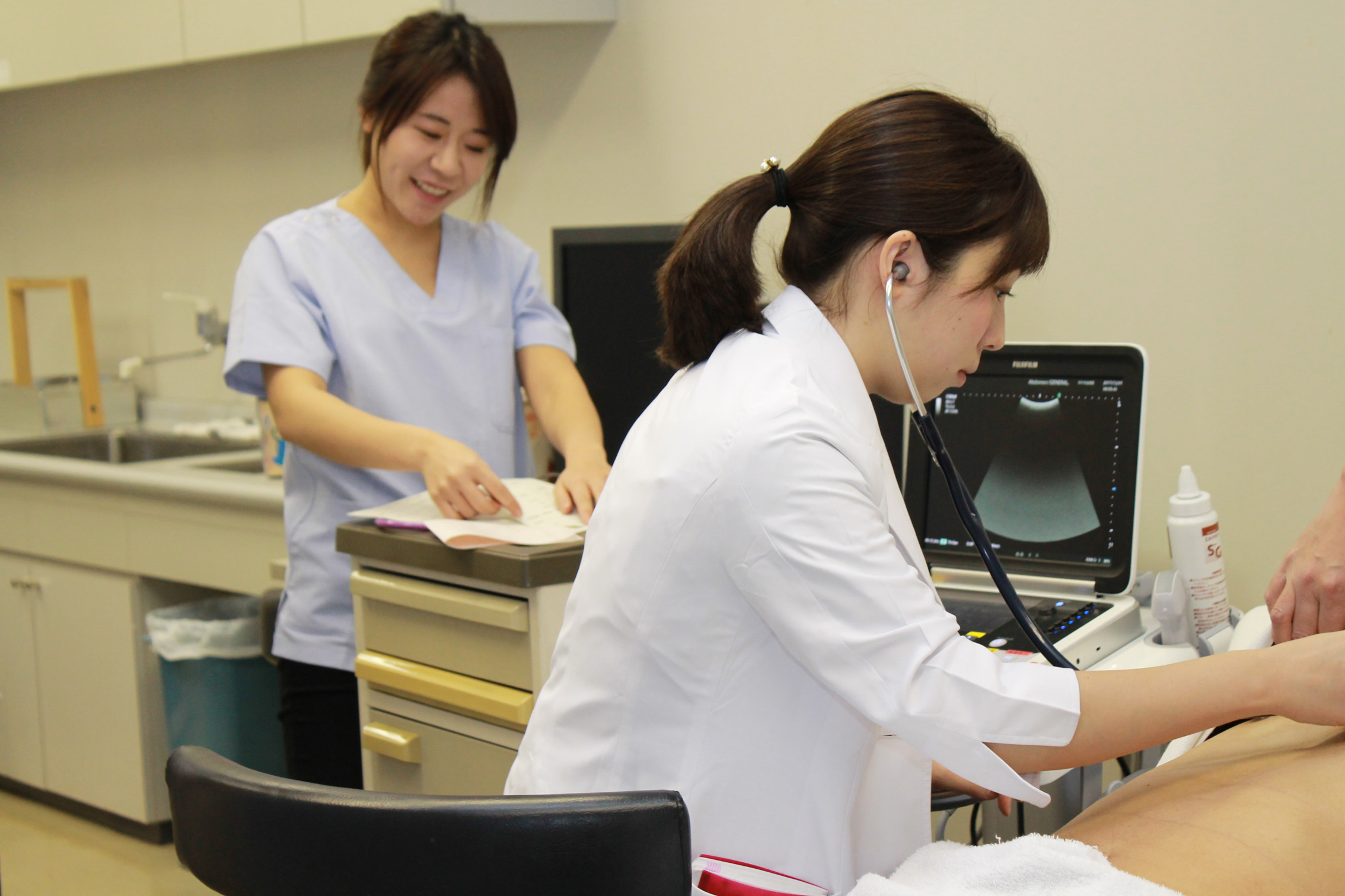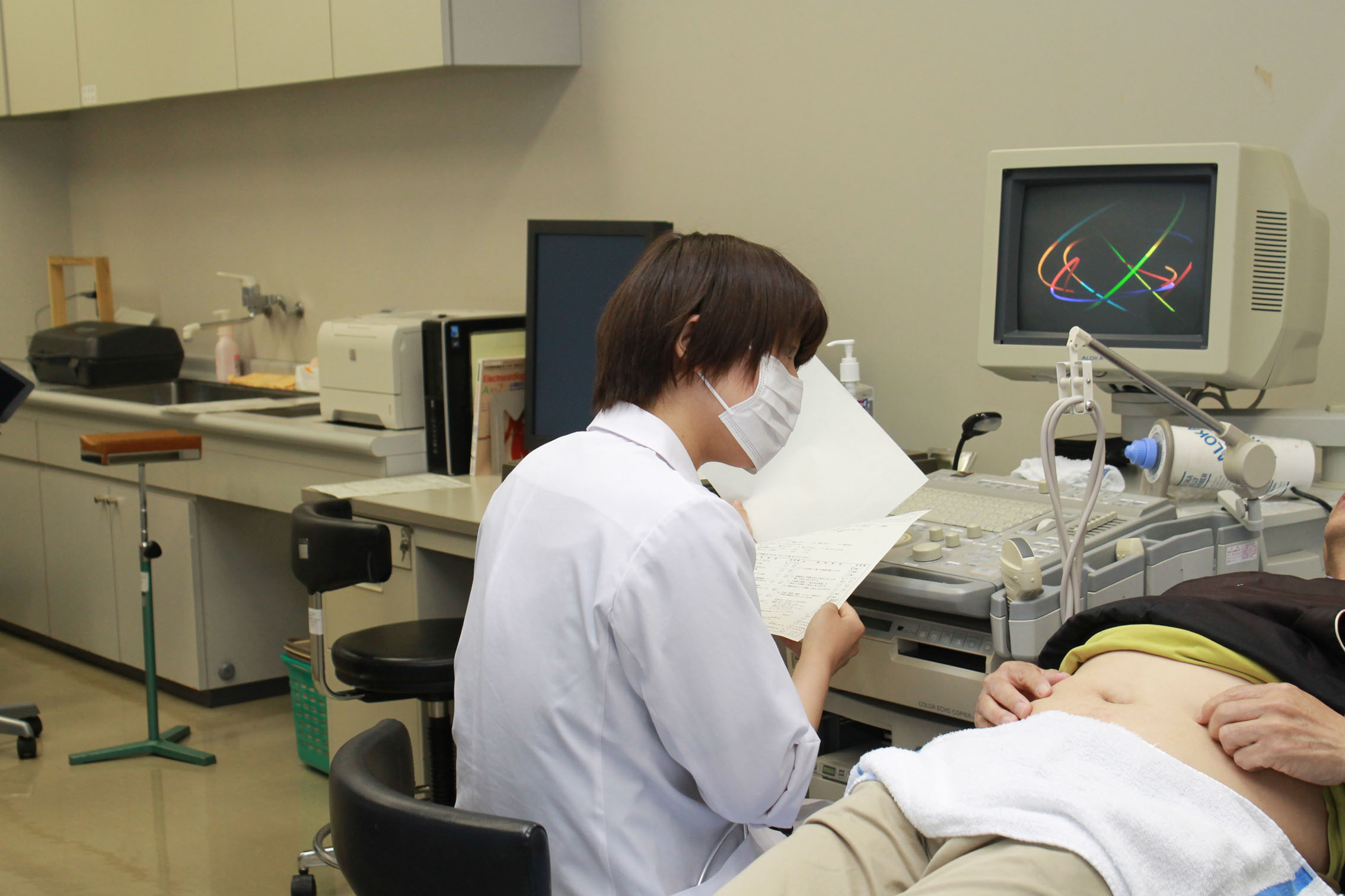 外来、病棟回診を終えて講義までの数十分の間にエコーの練習をされていました。優しい木谷先生が受診者役です。