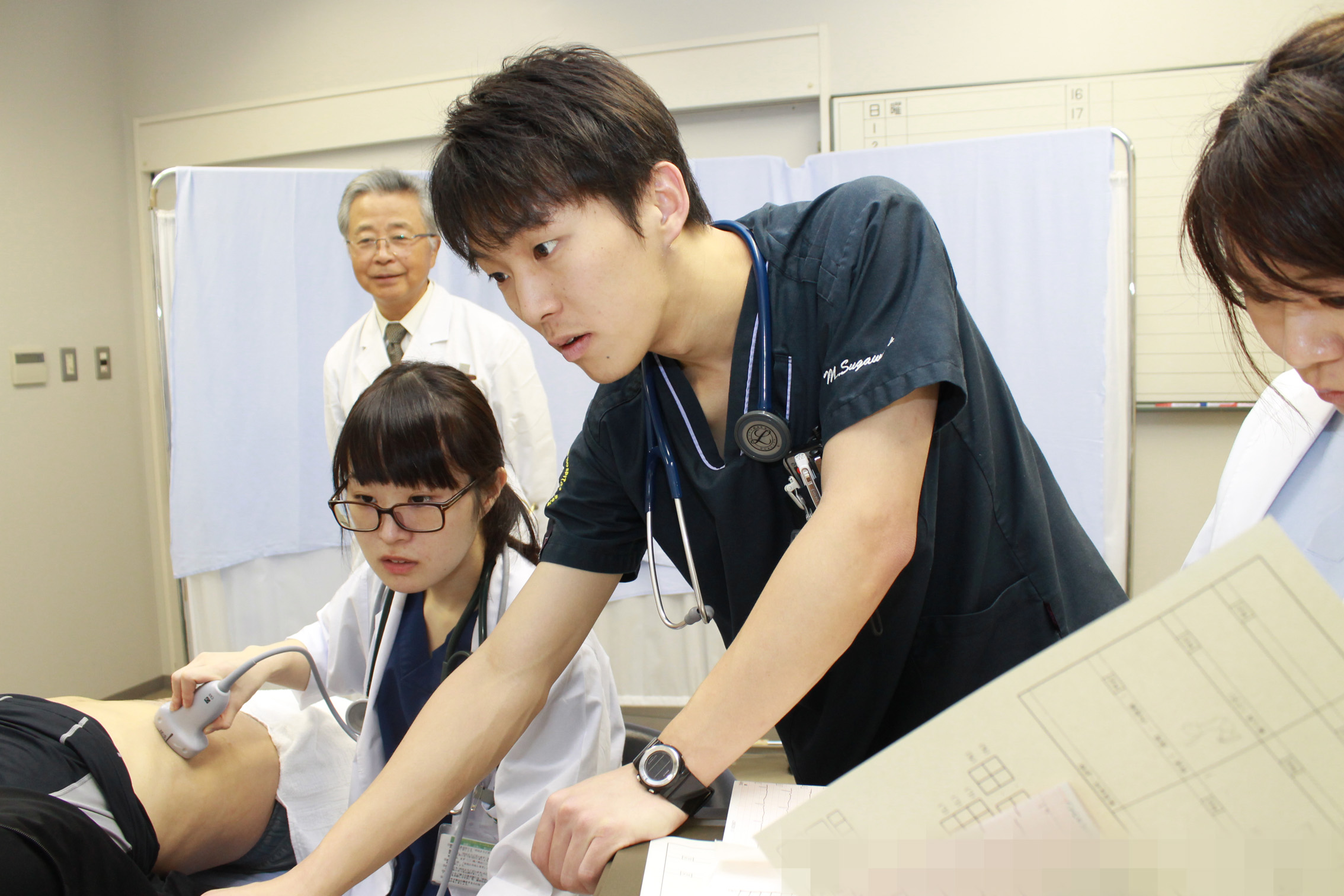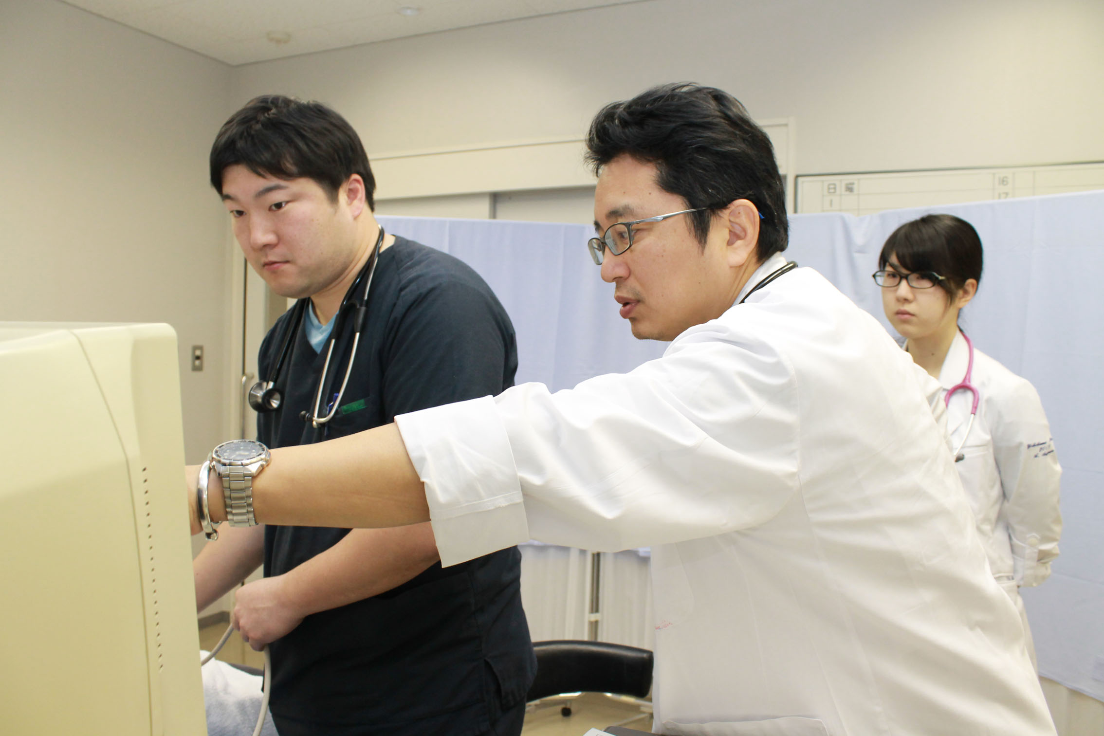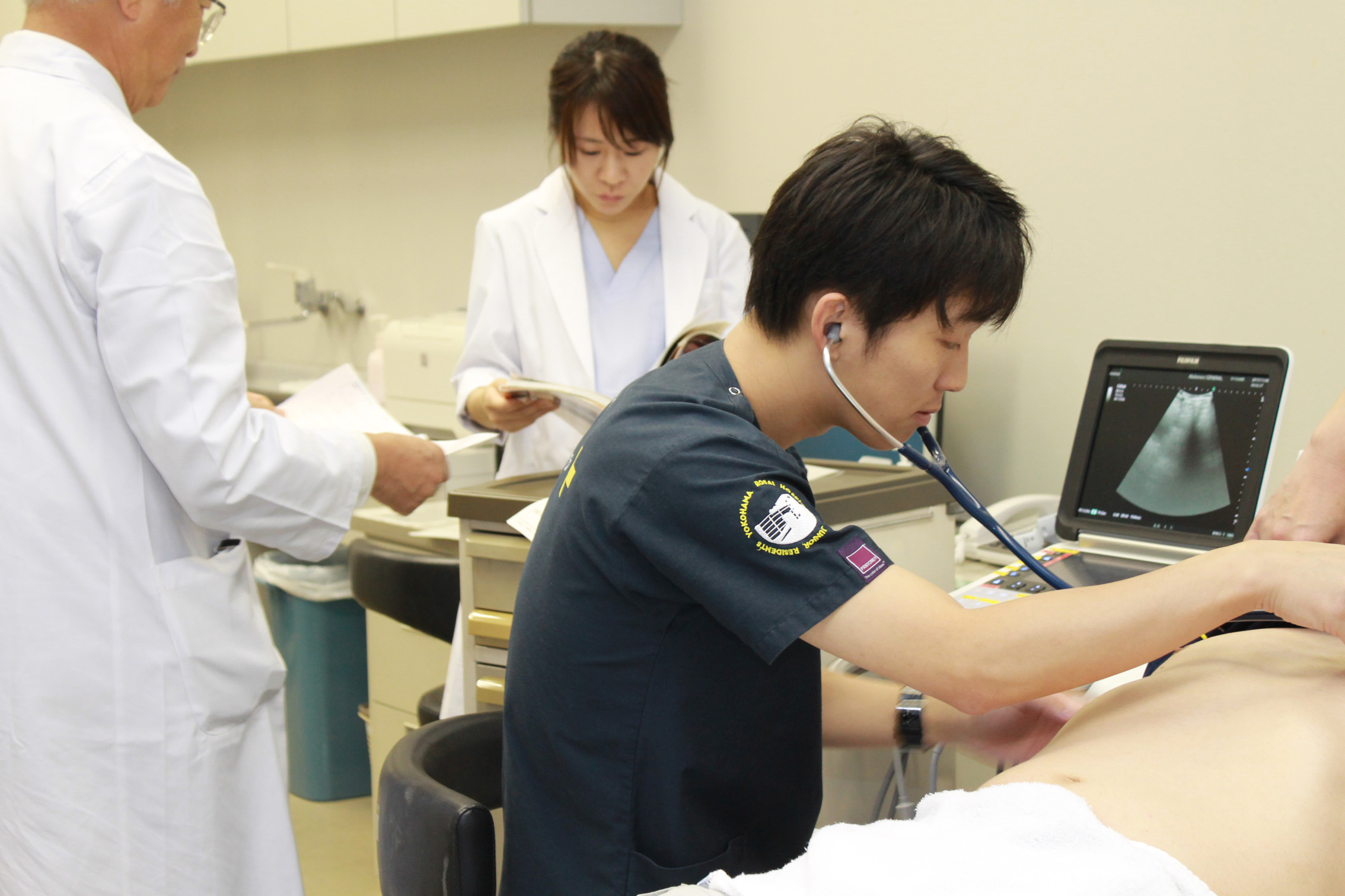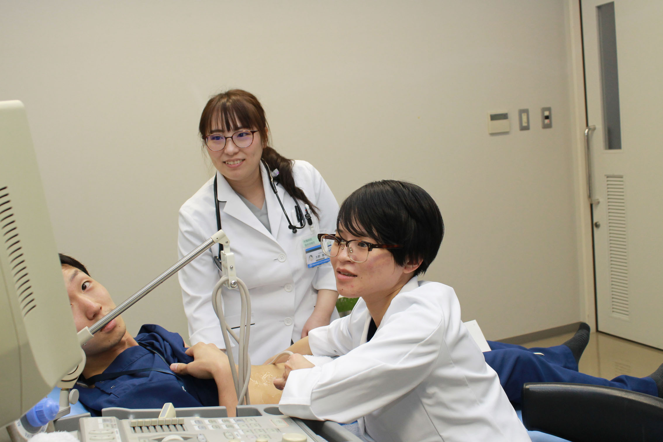 外来、病棟回診を終えて講義までの数十分の間にエコーの練習をされていました。優しい木谷先生が受診者役です。