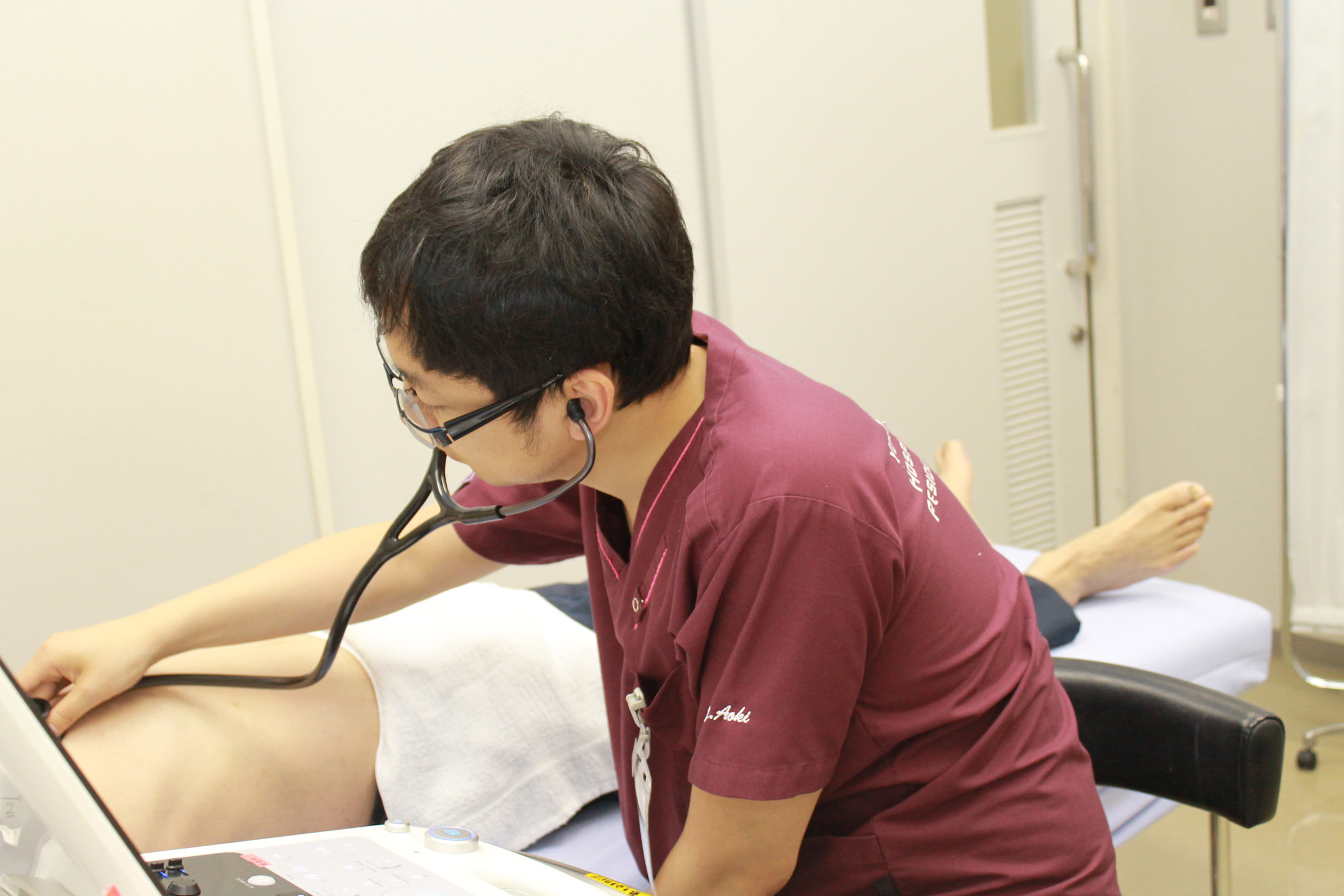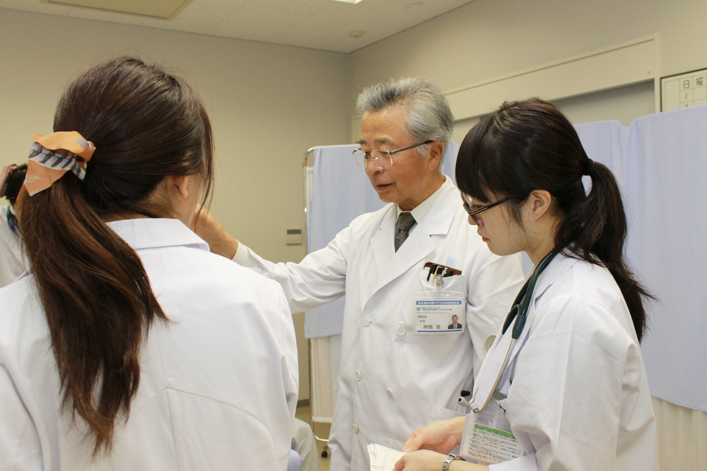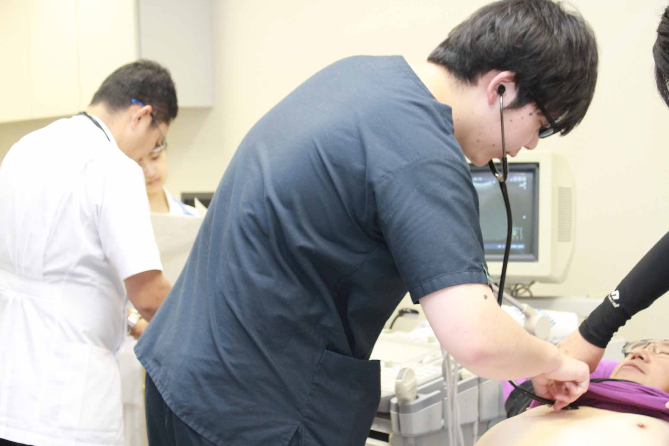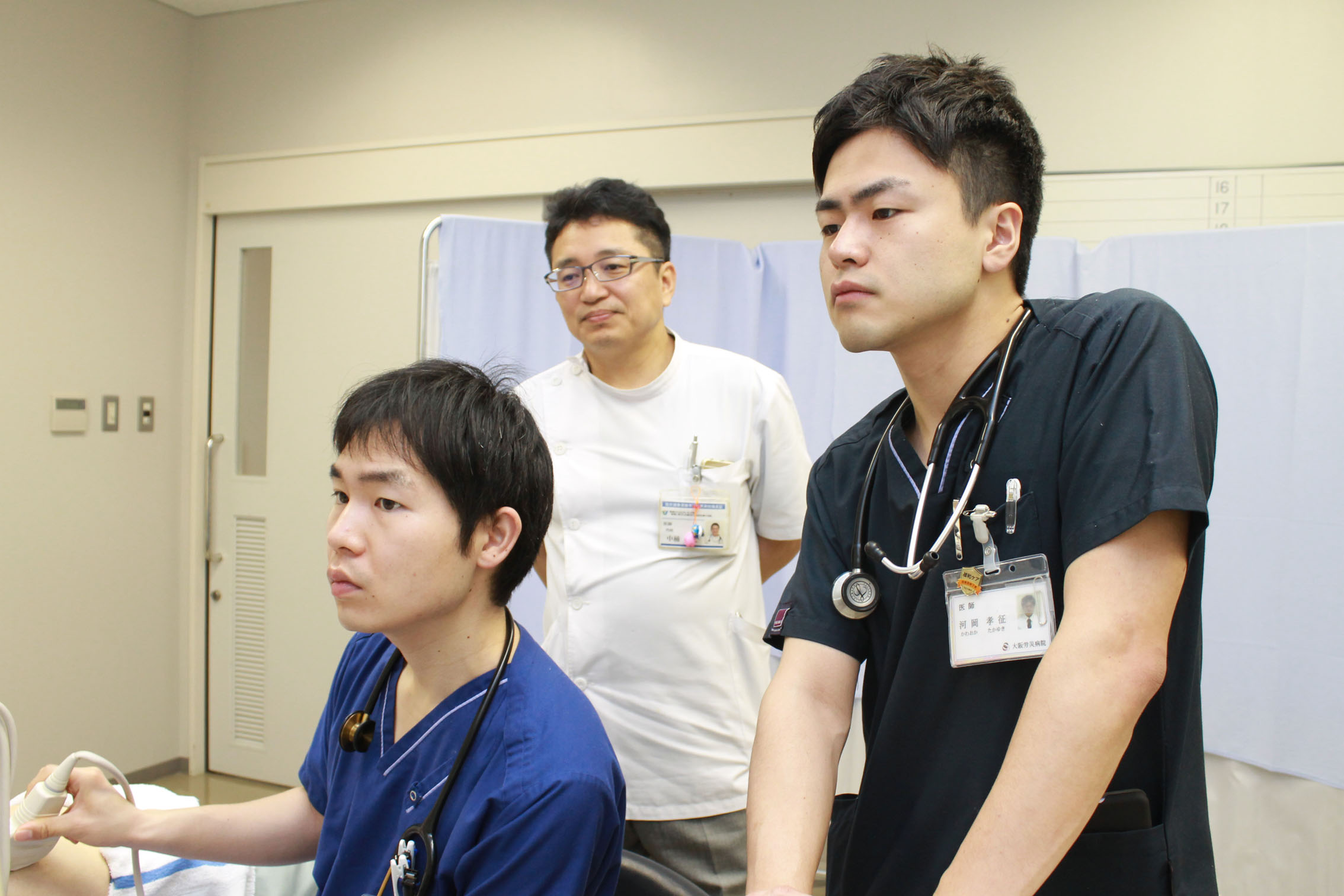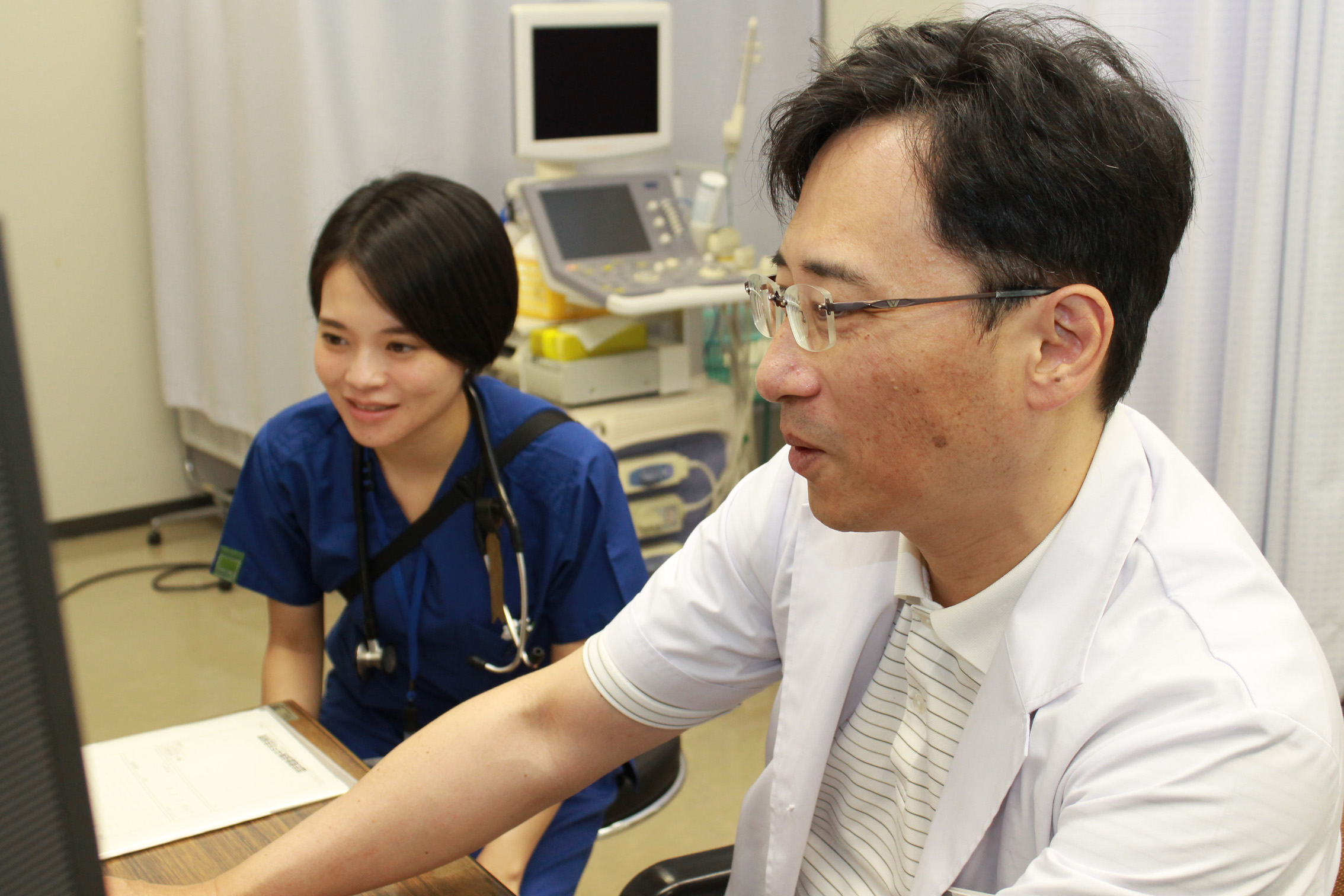 外来、病棟回診を終えて講義までの数十分の間にエコーの練習をされていました。優しい木谷先生が受診者役です。