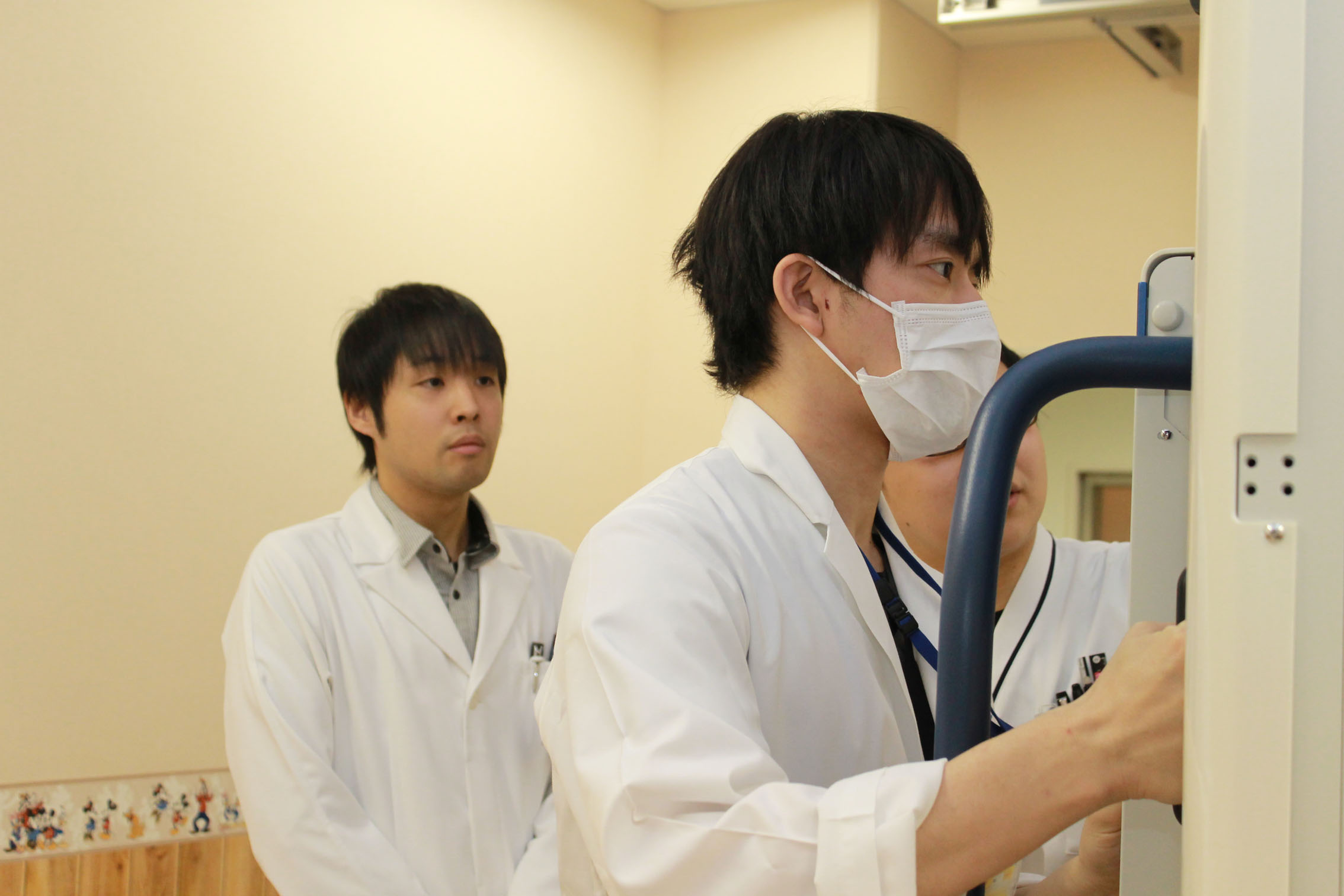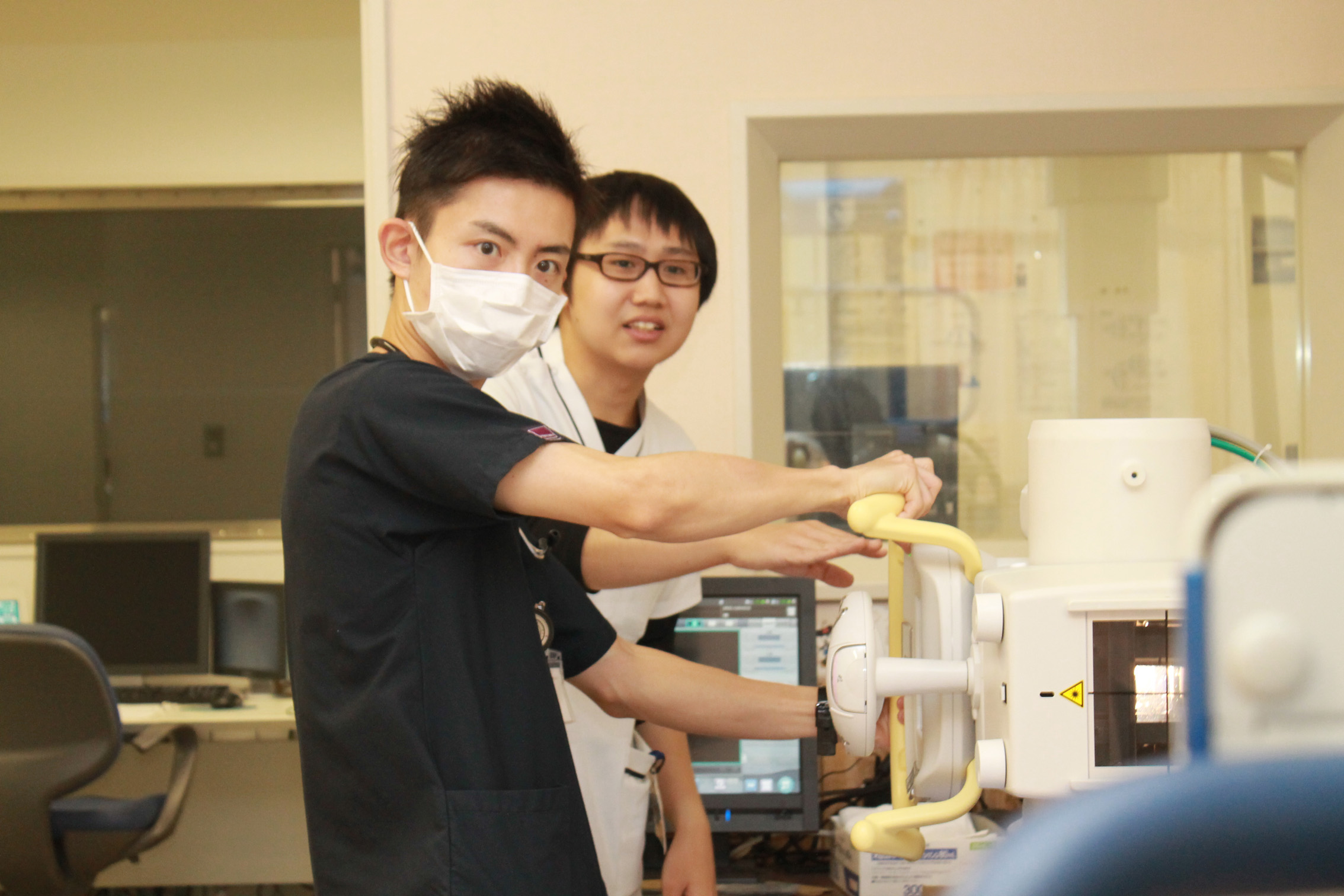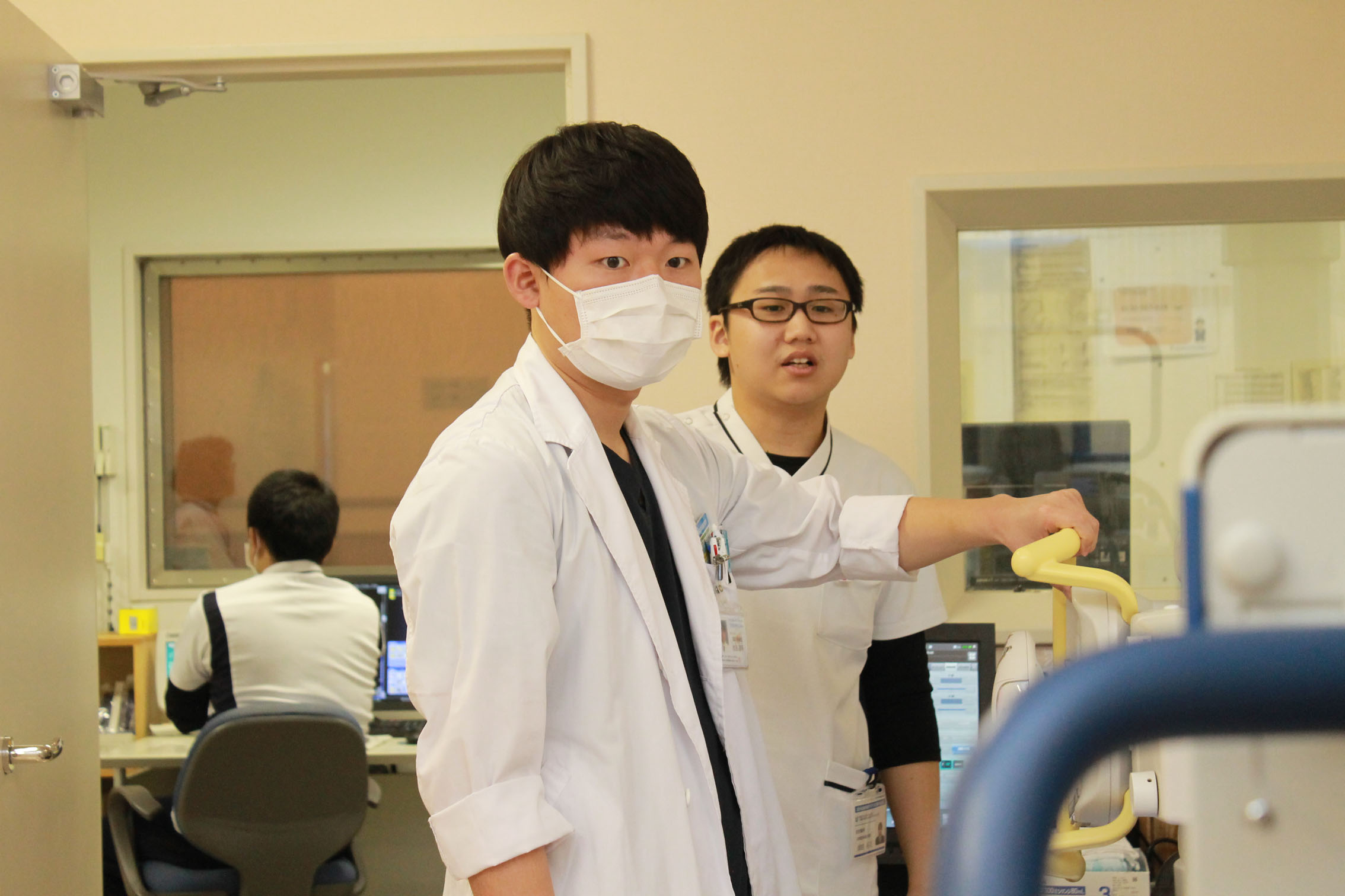 午前中、古泉先生と下永吉は放射線科実習に取り組みました。実際に胸部と腹部のレントゲンを撮り、オーダー後の流れや他職種について学びます。今後にいかせると感じました。