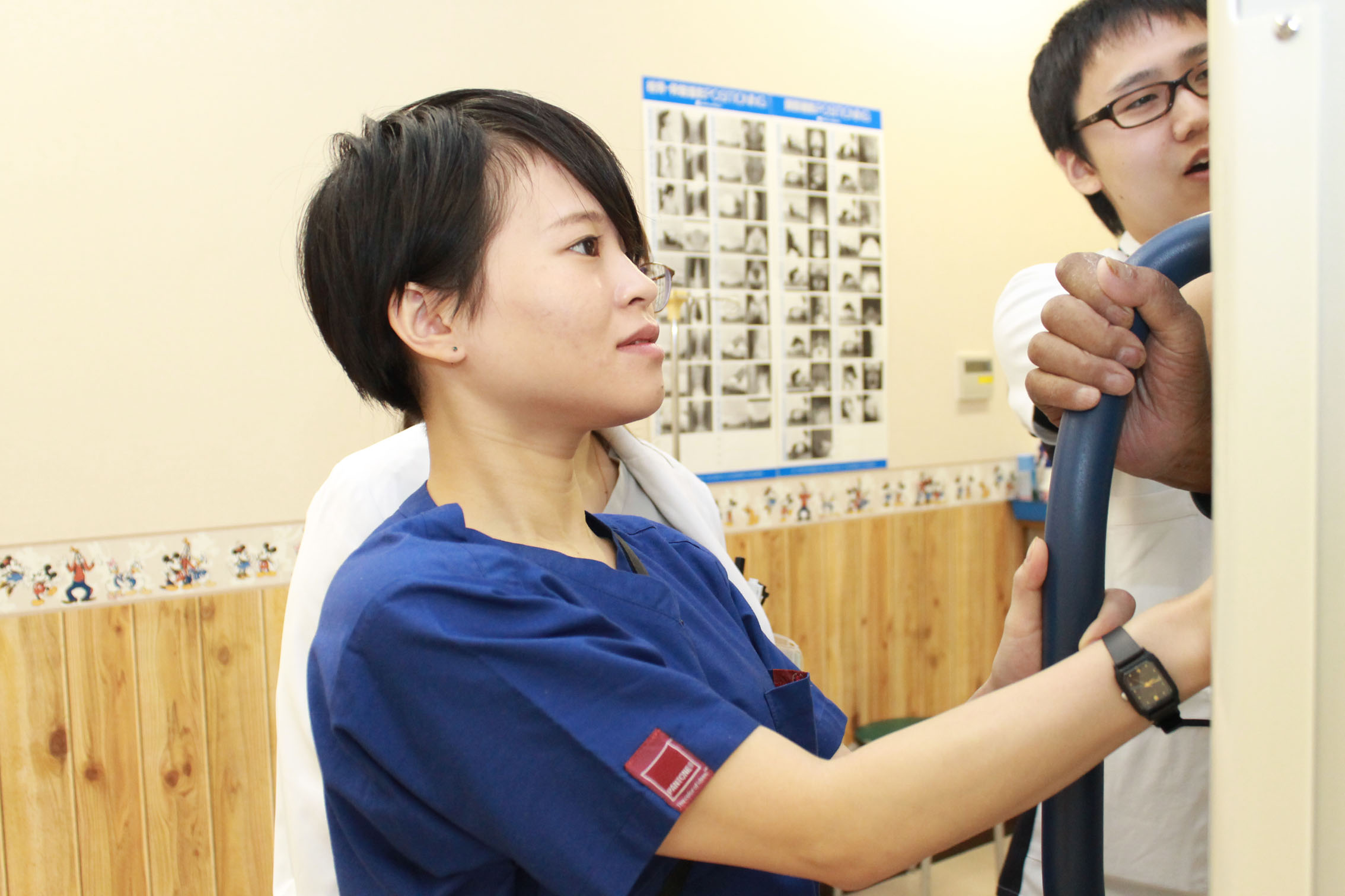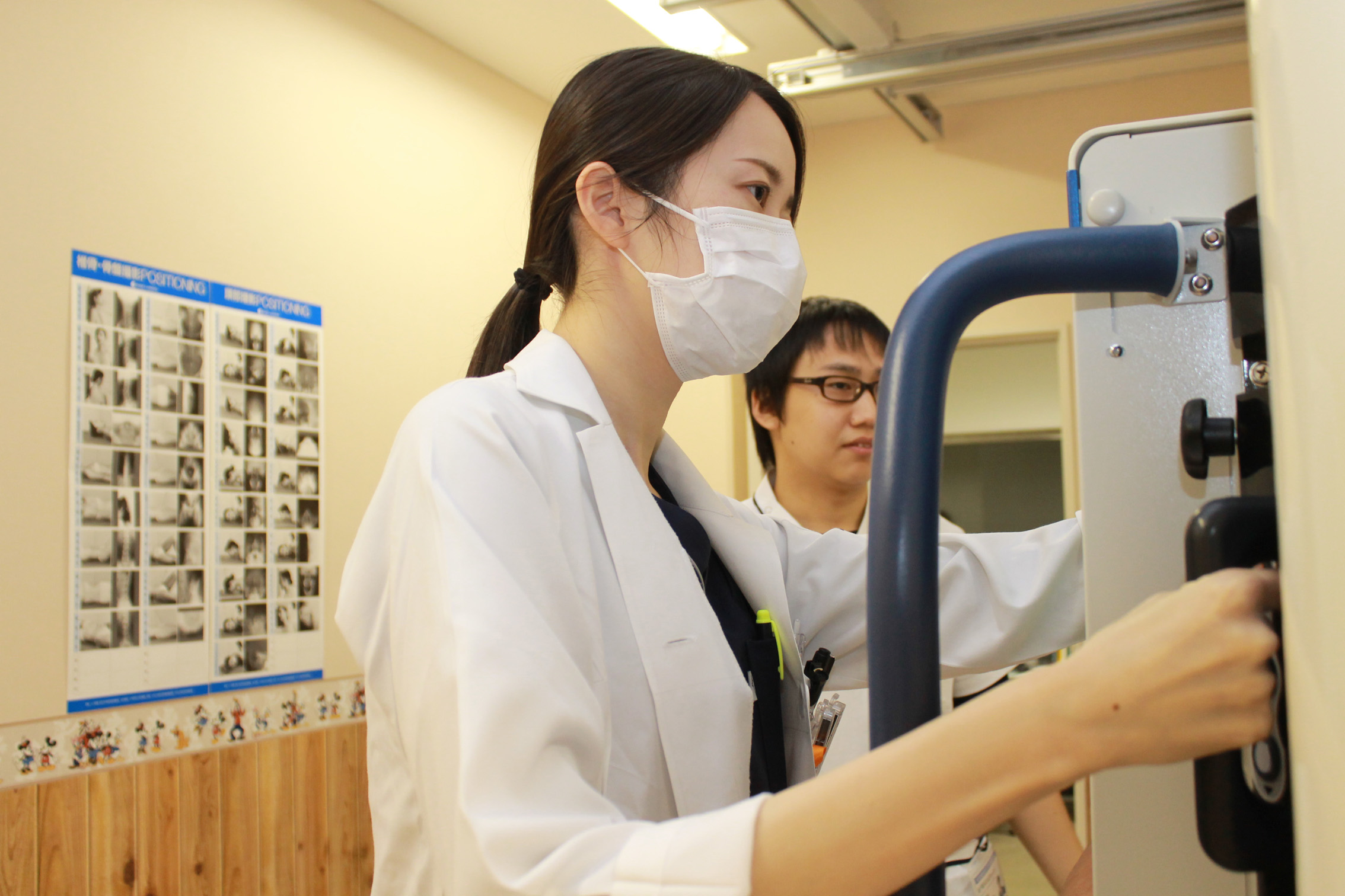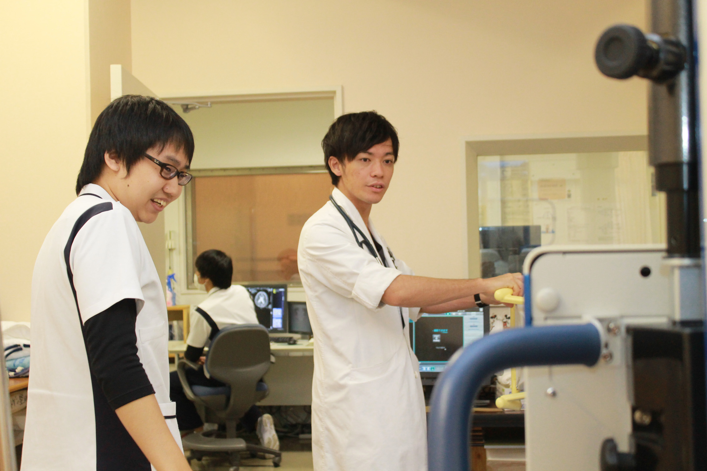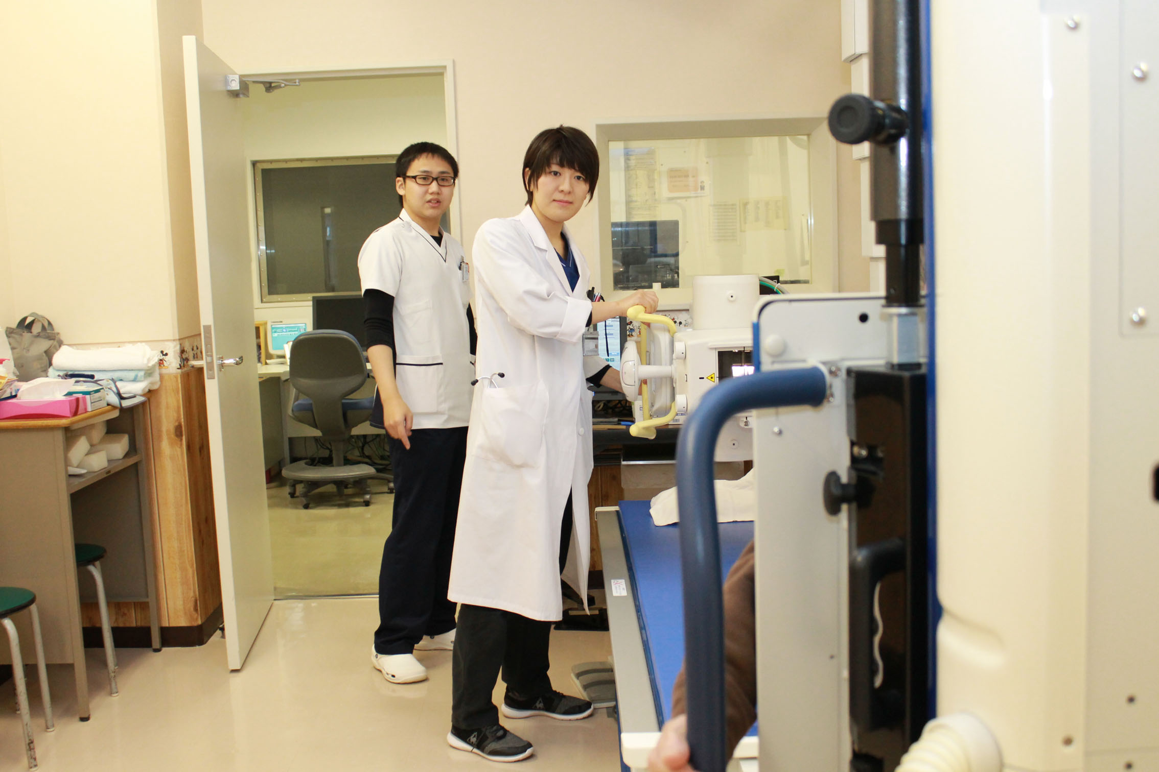 午前中、古泉先生と下永吉は放射線科実習に取り組みました。実際に胸部と腹部のレントゲンを撮り、オーダー後の流れや他職種について学びます。今後にいかせると感じました。