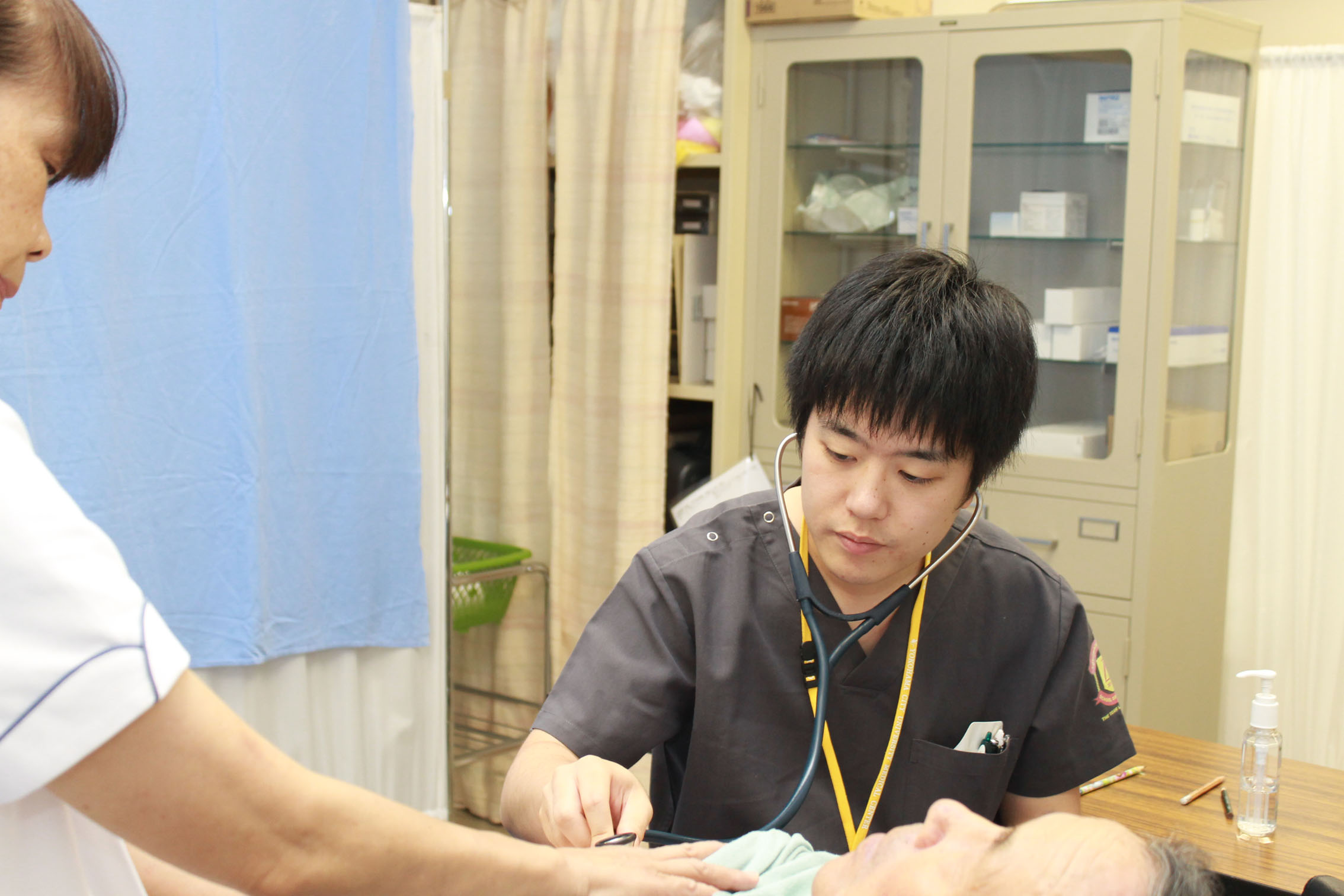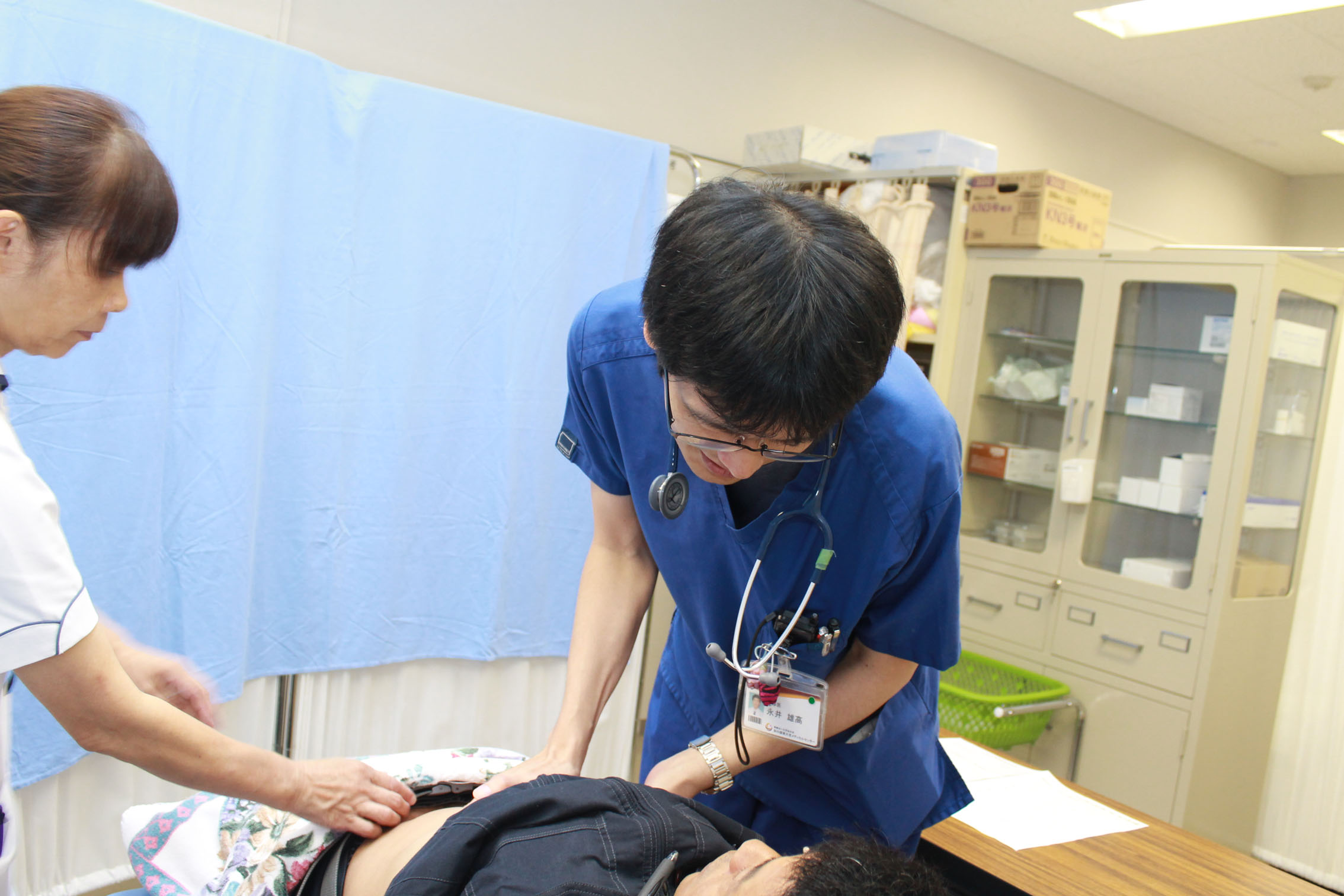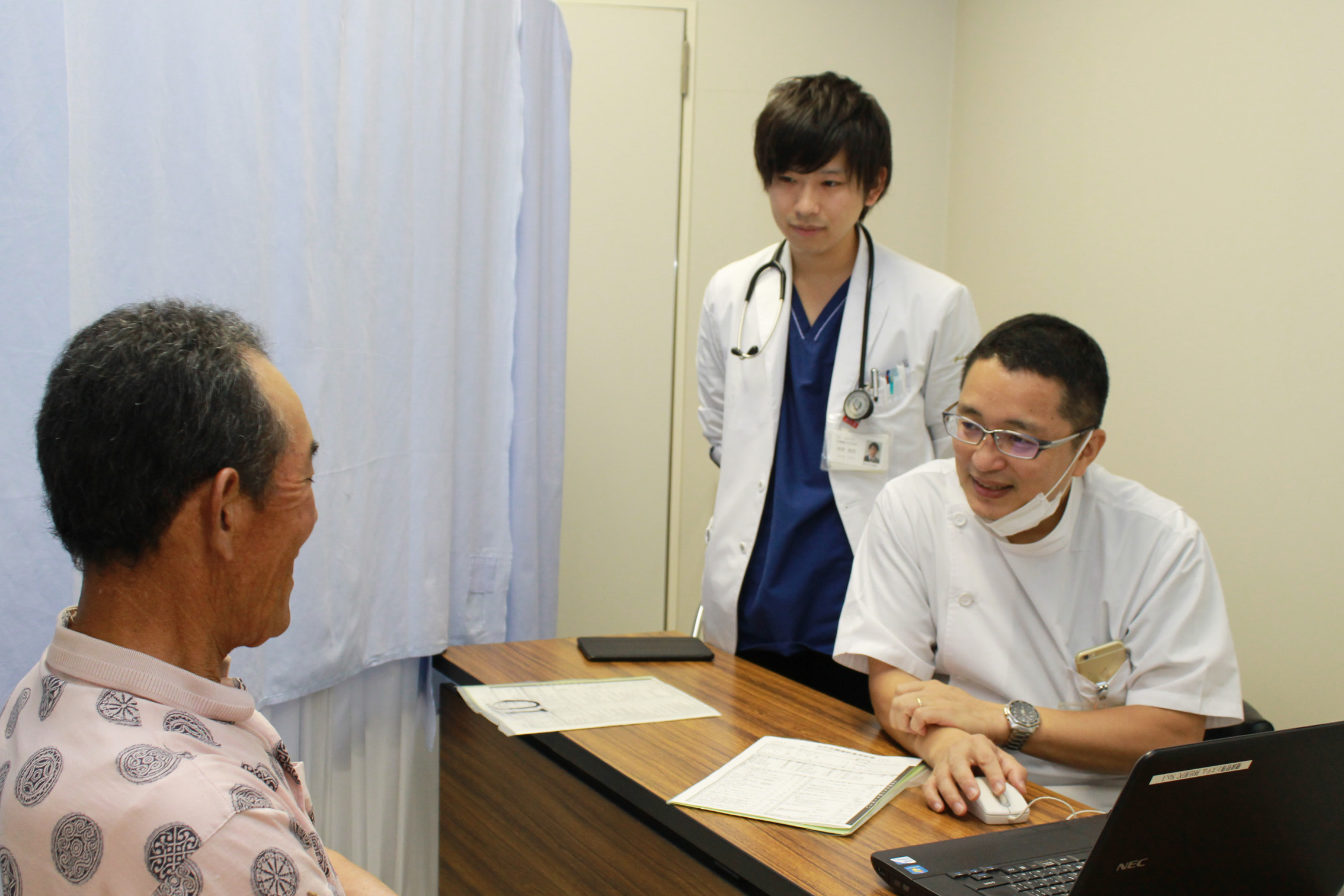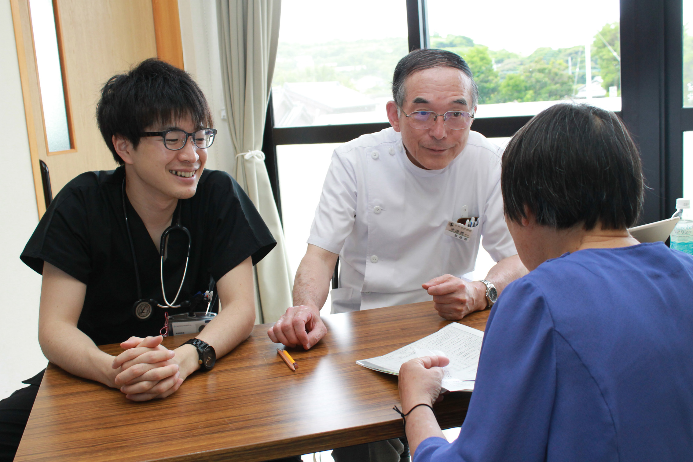 研修医の先生方、交代で診察・問診と手際よくされています。古泉先生が、「よかですか?」「食べりますか?」と平戸弁を交えて優しく話しかけると患者さんも安心した様子で答えていました。