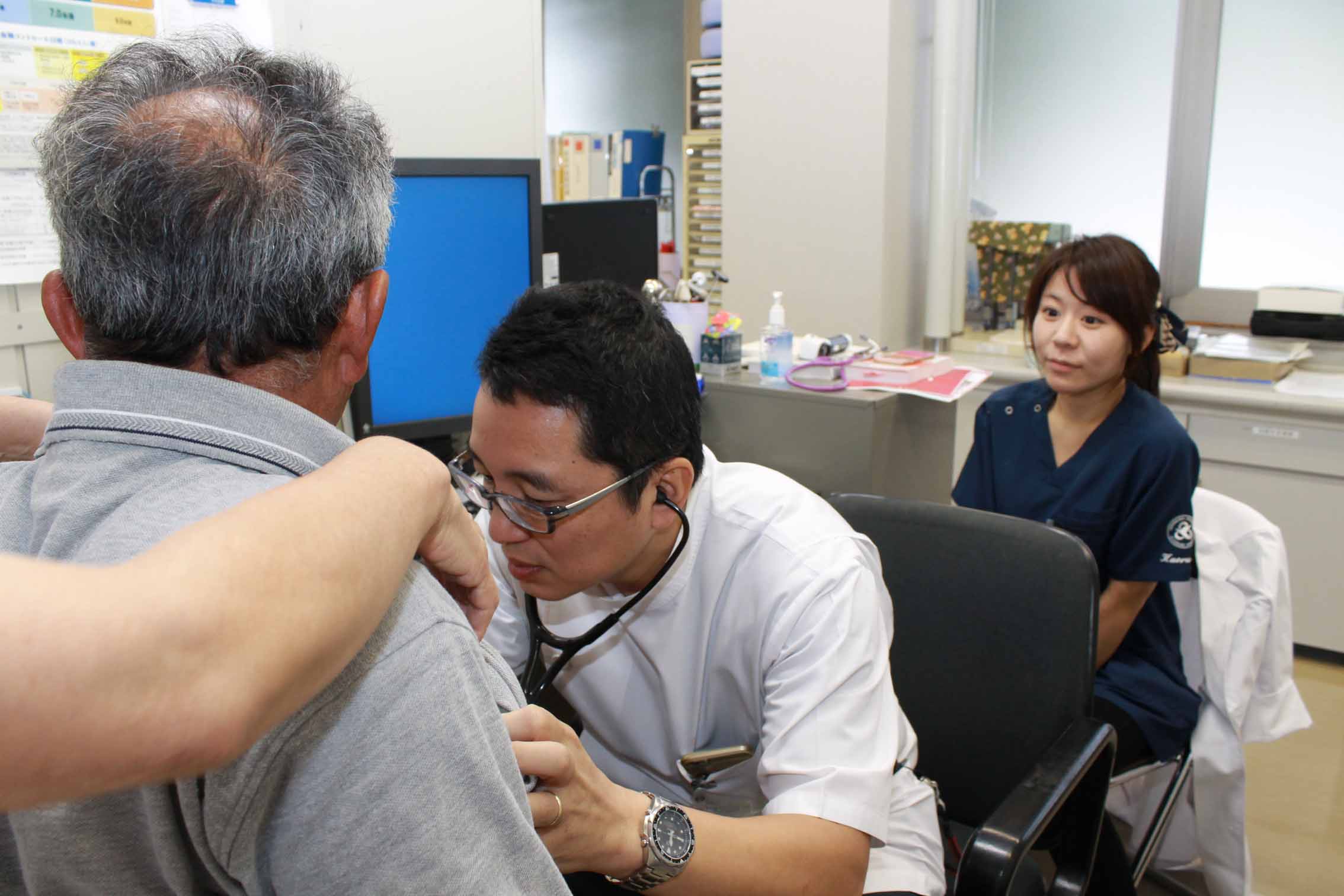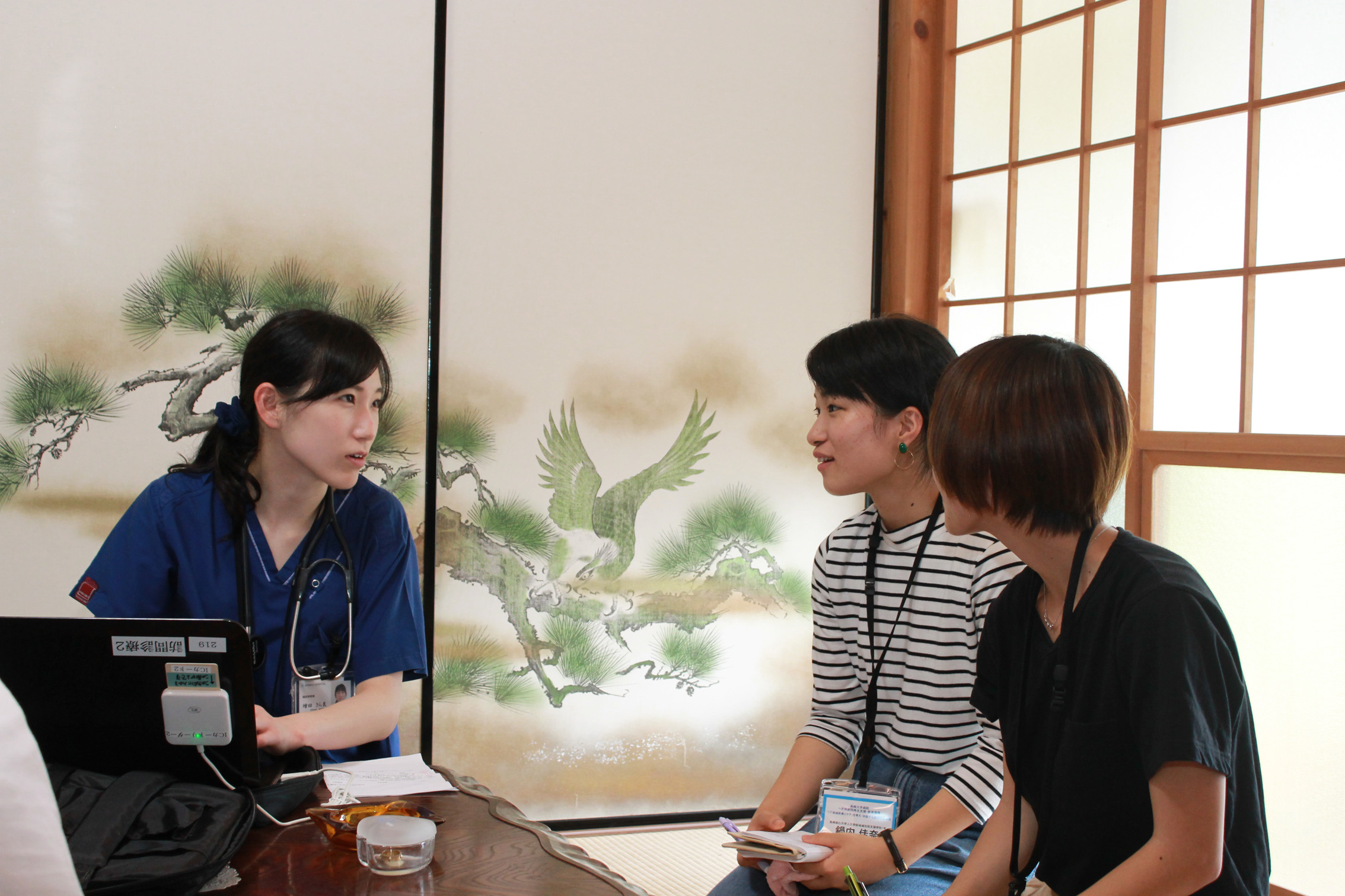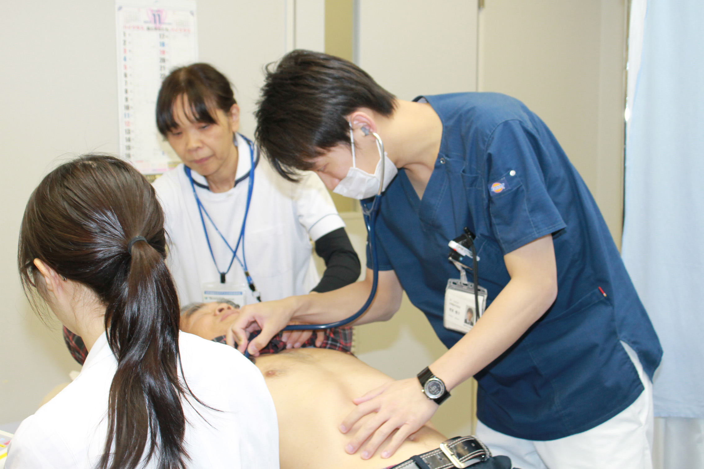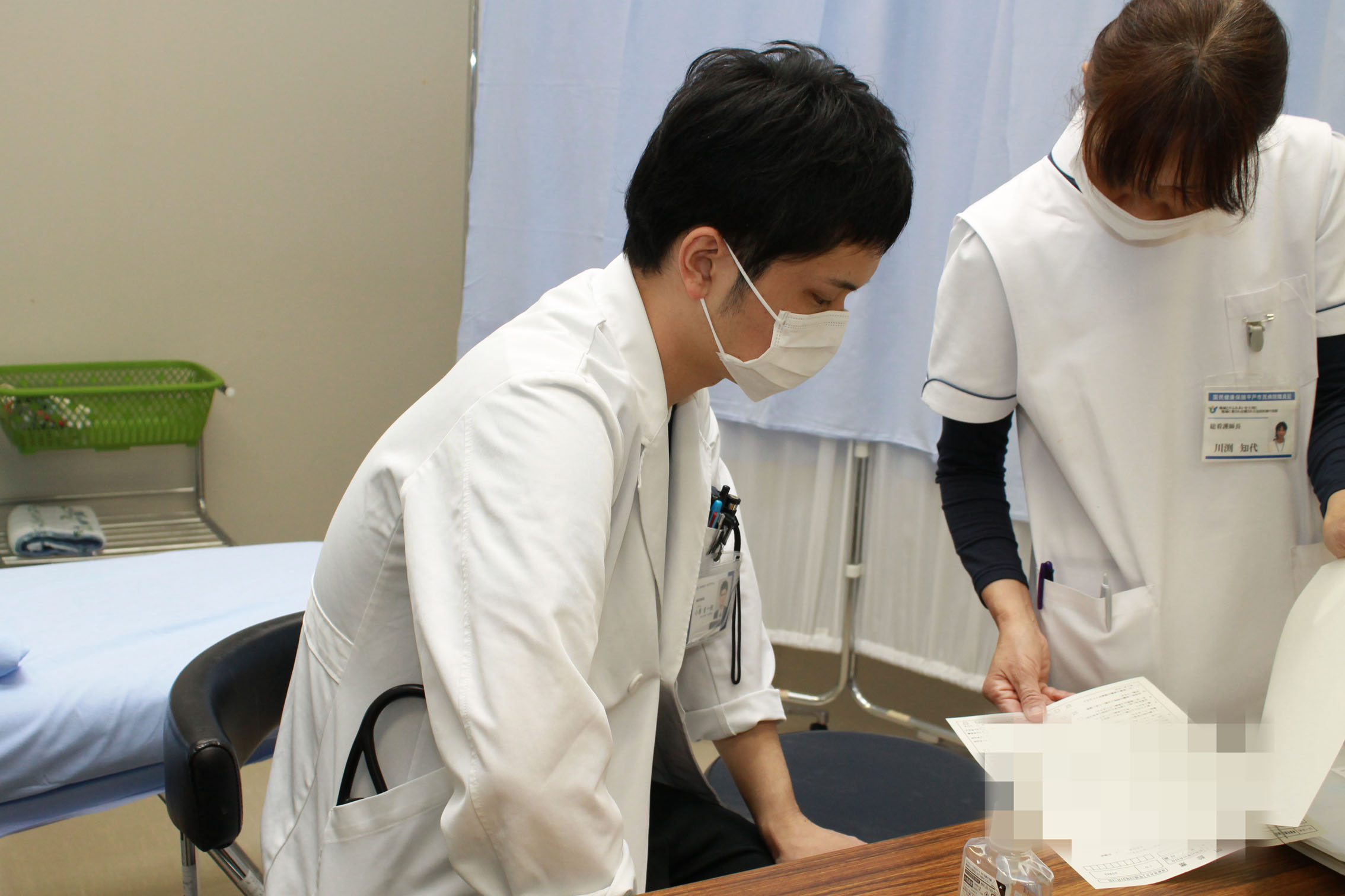 研修医の先生方、交代で診察・問診と手際よくされています。古泉先生が、「よかですか?」「食べりますか?」と平戸弁を交えて優しく話しかけると患者さんも安心した様子で答えていました。