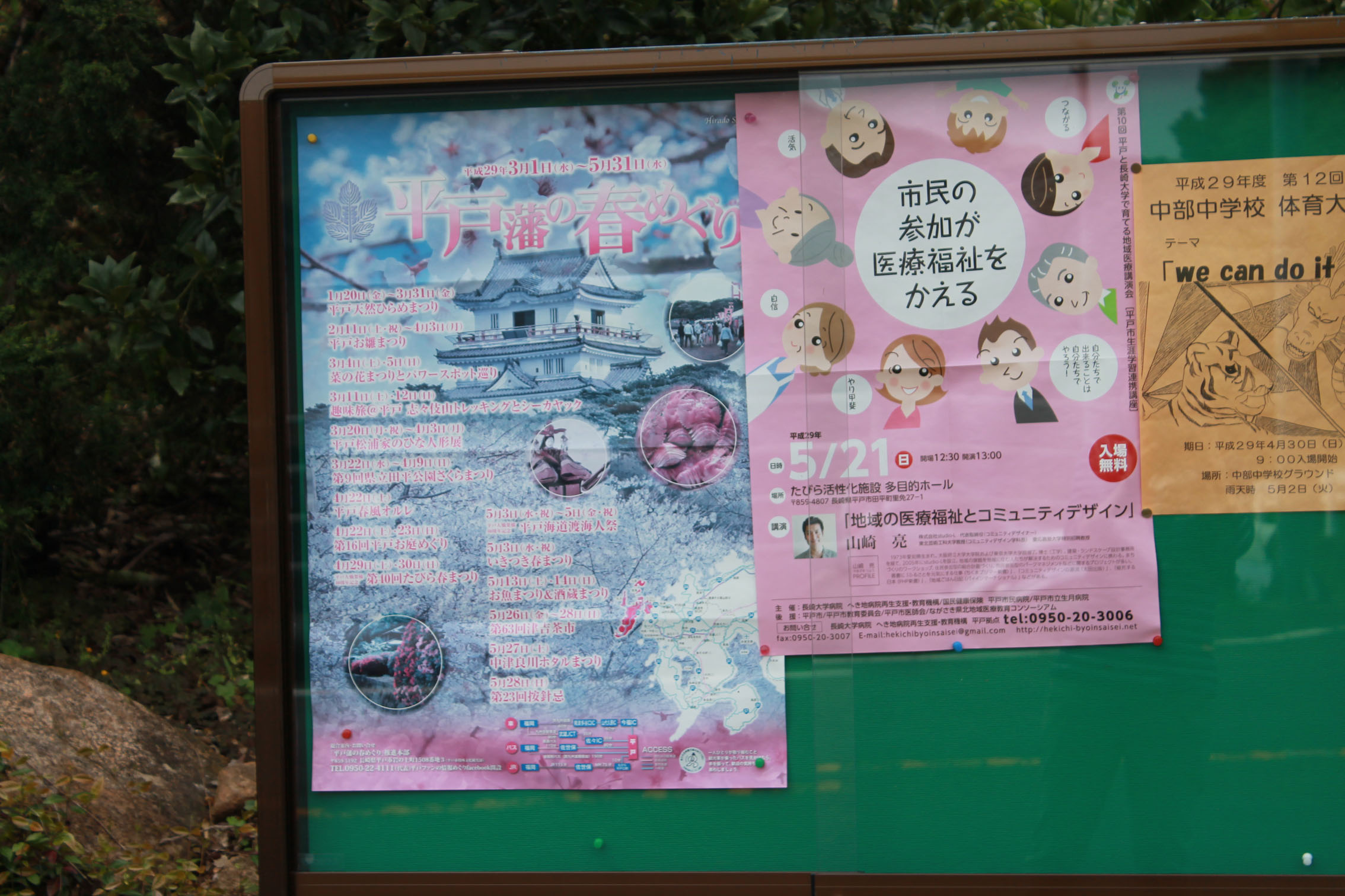 5月21日に株式会社studio-L代表取締役 山崎亮氏をお招きして地域医療講演会を開催いたします。(詳しくはHPトップページをご覧ください)平戸の各地区にも区長さんを通して講演会ポスターが掲示され、道行く人たちにご覧になっていただいています。