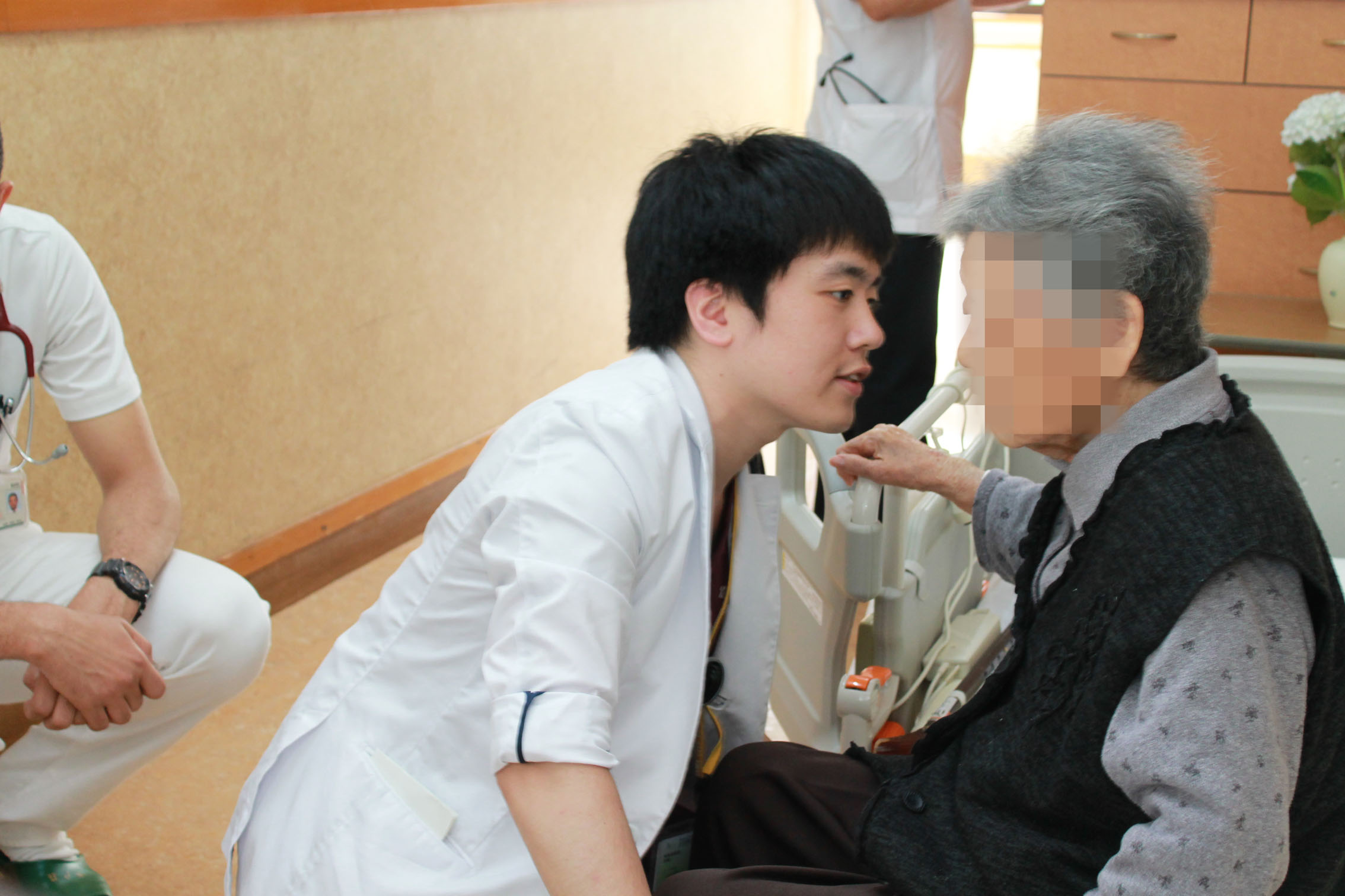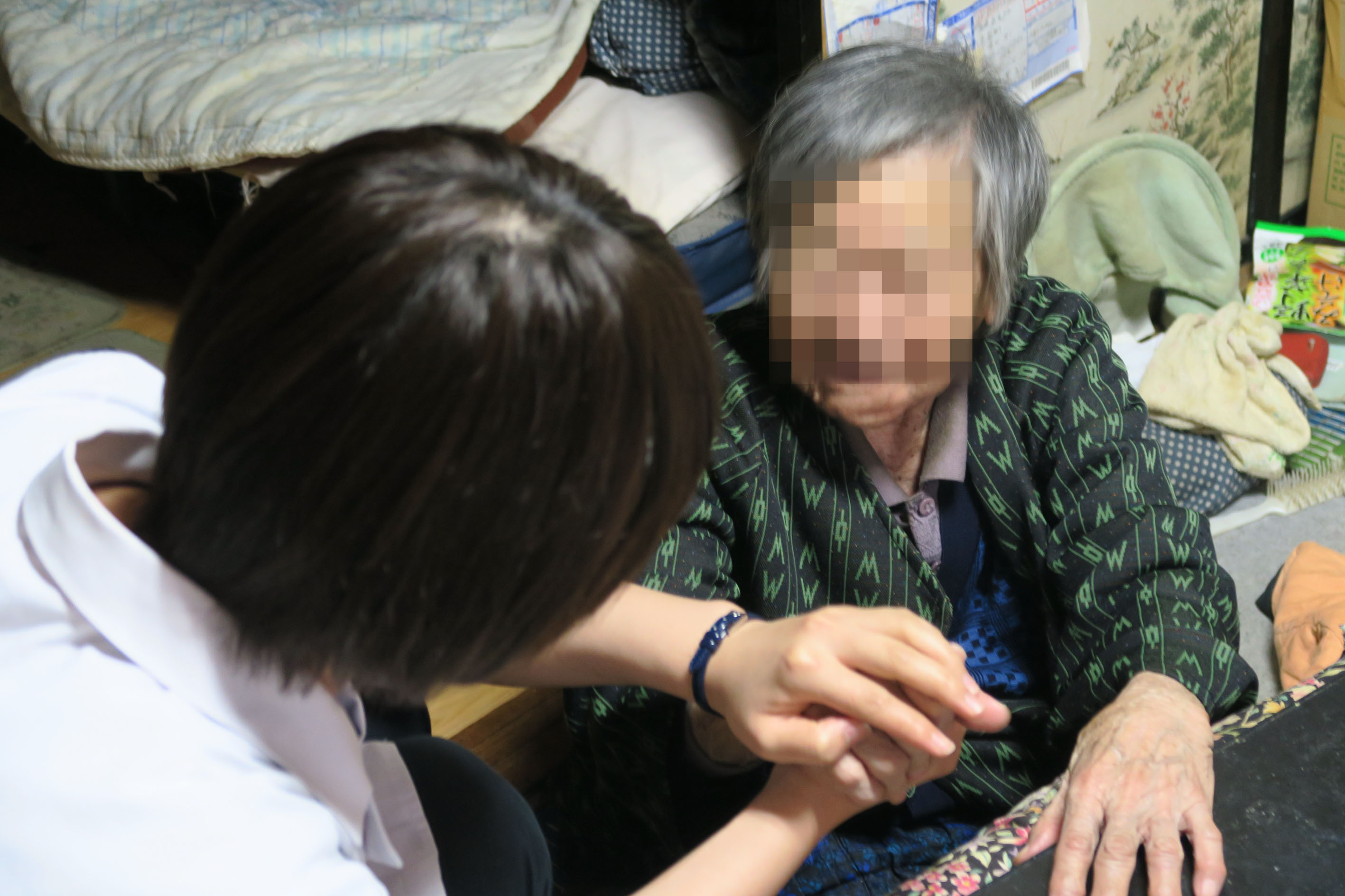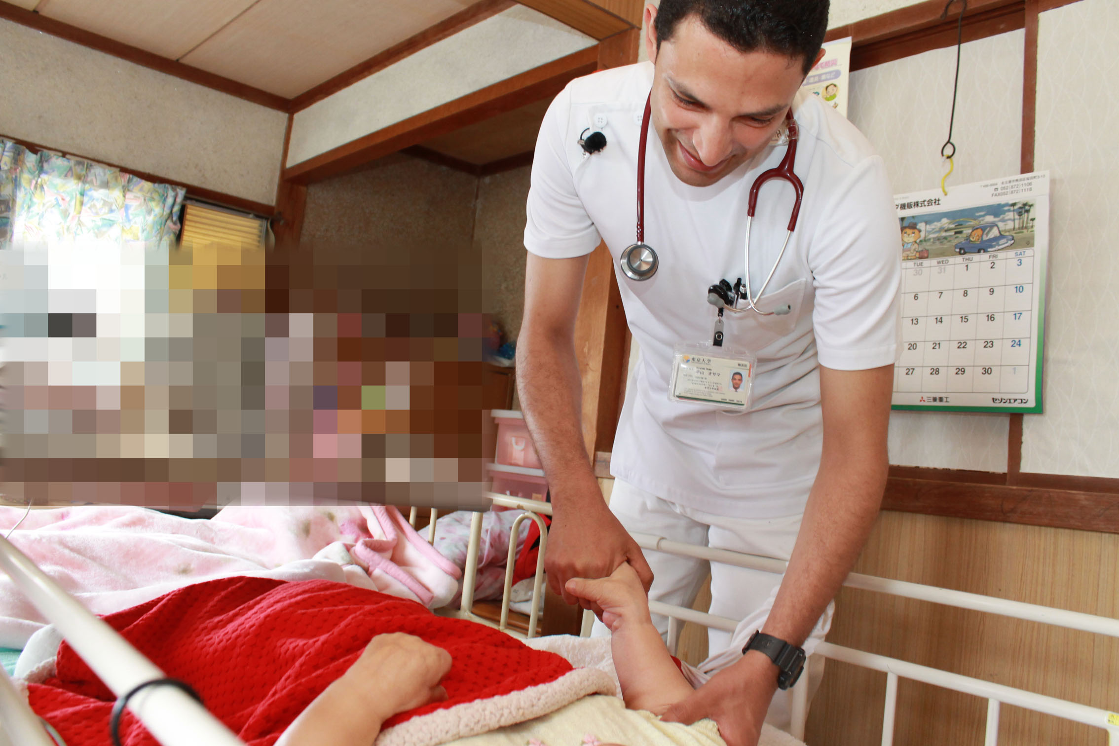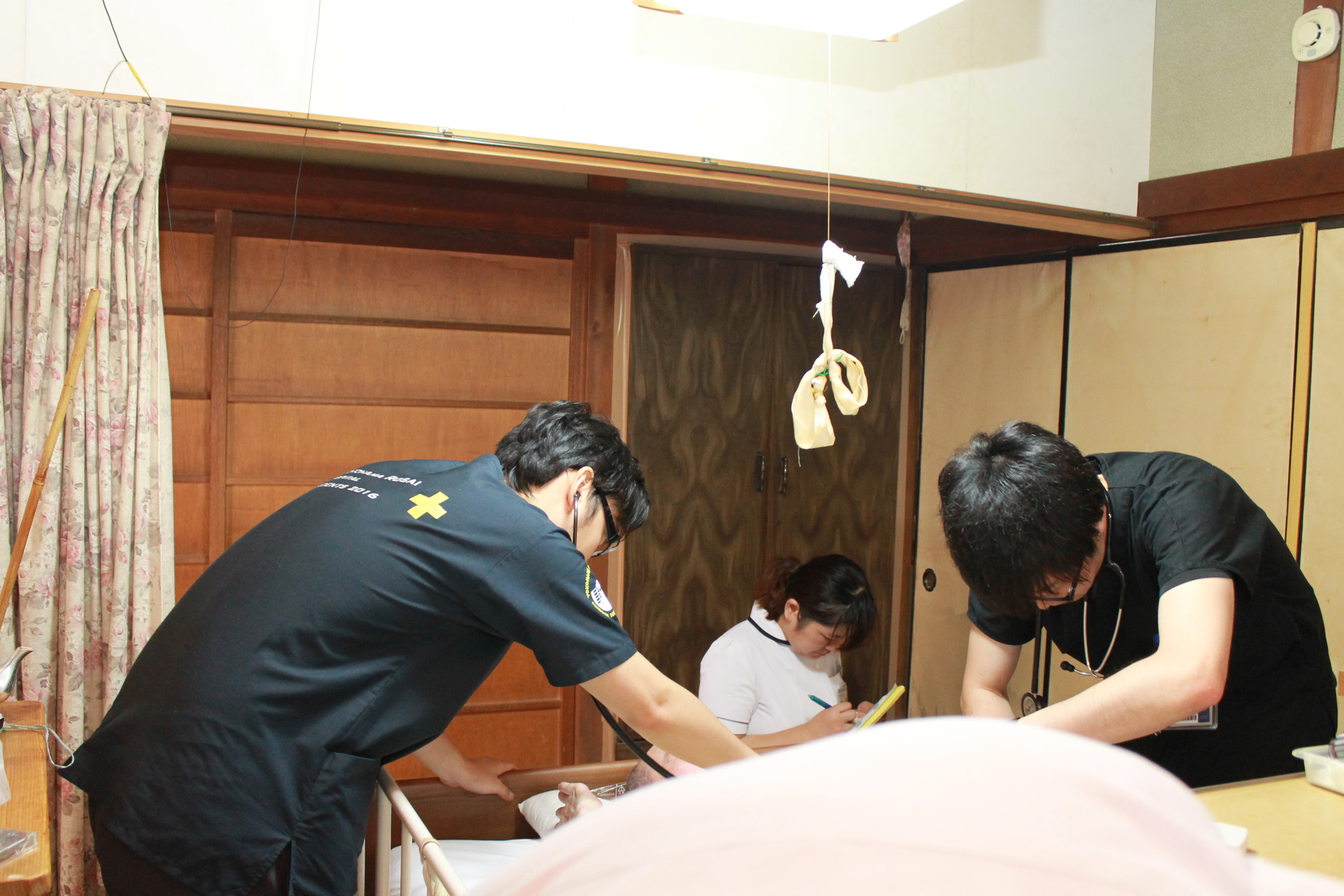 お宅に伺うと患者さんが暖かく迎えてくださいました。方言が独特で、皆さん分かりずらいと最初に感じる難関があります。外来よりも在宅の方が更に方言が強くなる傾向にあります。今回、先生方は患者さんに触れながら声かけをしたそうです。
