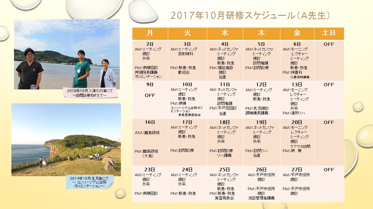今月は通常の研修スケジュールに加えて、福祉施設と平戸市役所の事業所健診が行われ、研修医の先生方も押淵院長方と取り組む予定です。