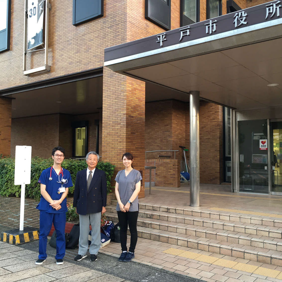 本日、五十嵐先生と井廻先生の地域医療研修が終了いたしました。最後の紹介写真は順に、押淵院長との訪問診療へ出発、実習発表会、そして、最後の実習となった平戸市役所での健診を終えてのショットです。