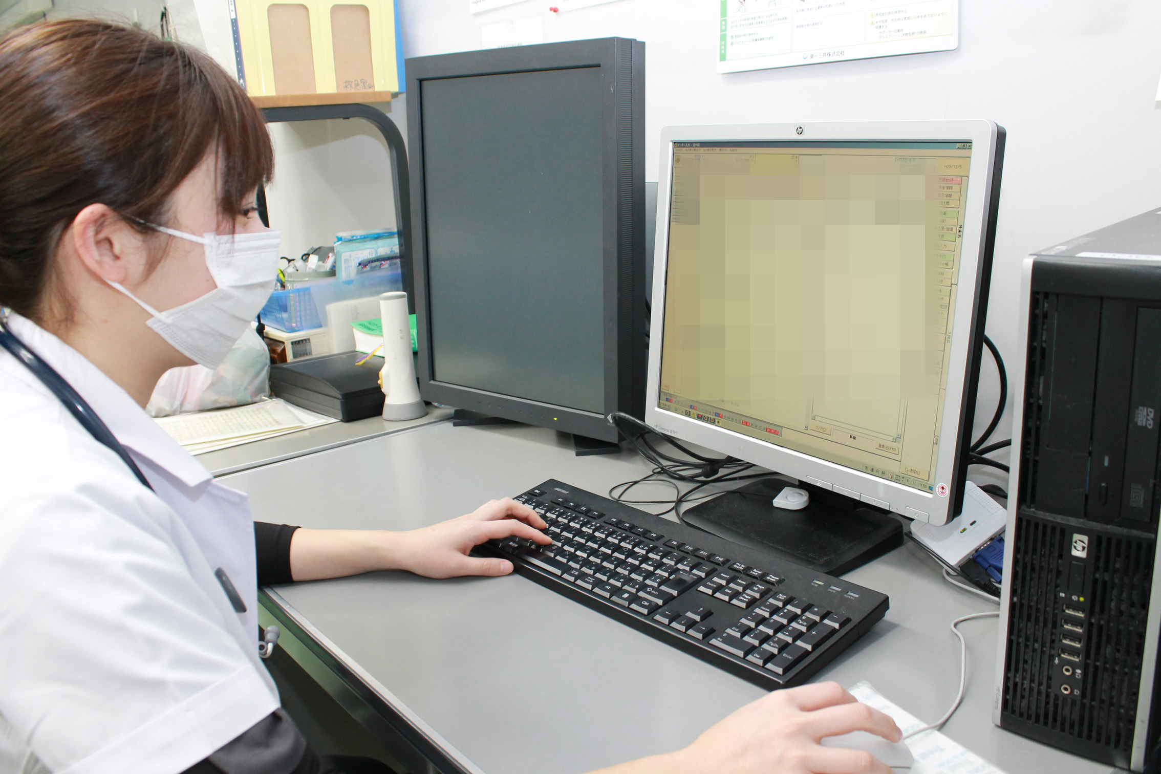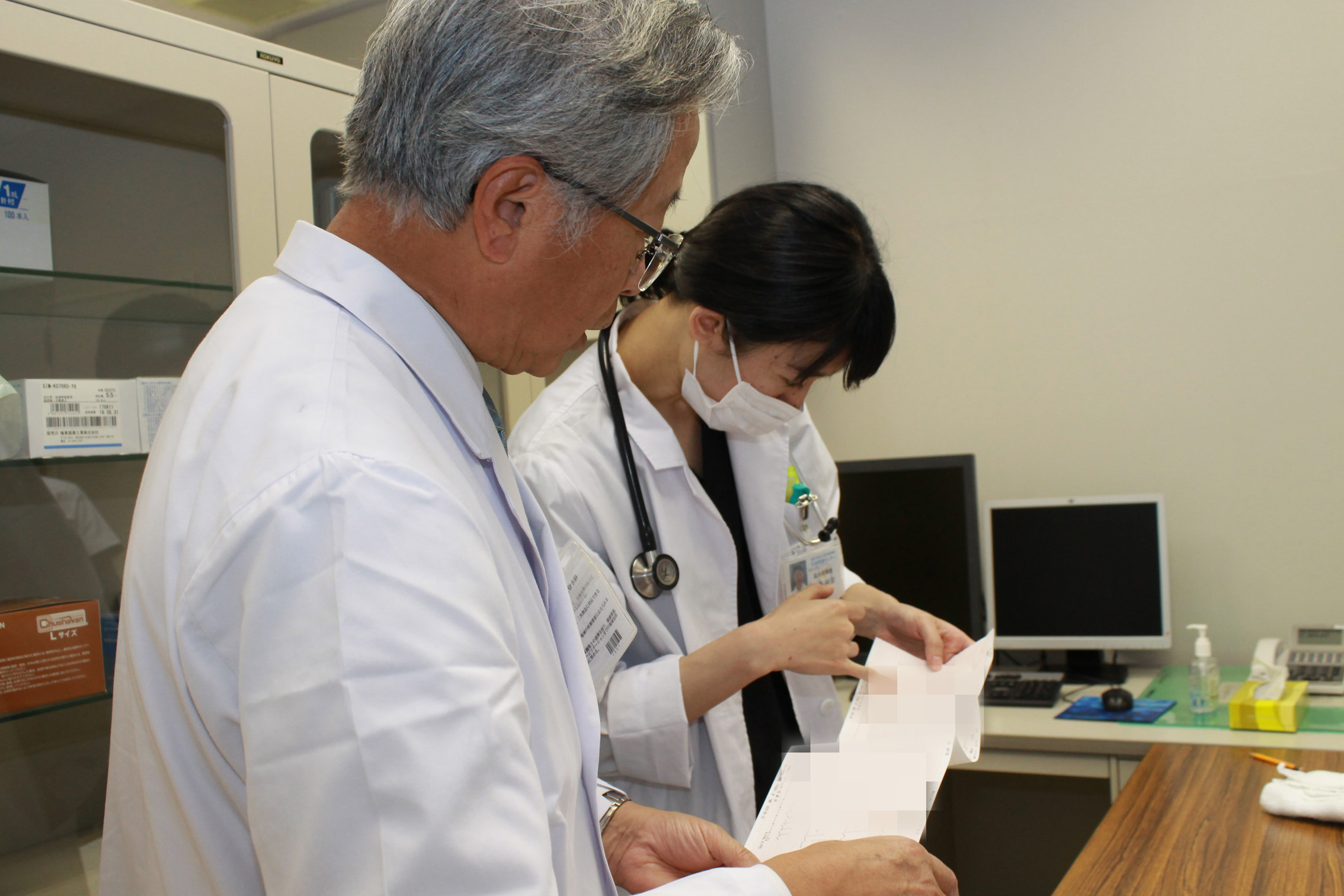 1枚目の写真は菅原先生が中桶先生と新患を担当したときのもので、患者さんが来られる前にカルテを見て確認中の様子です。この後、席を交代し菅原先生が診察しています。